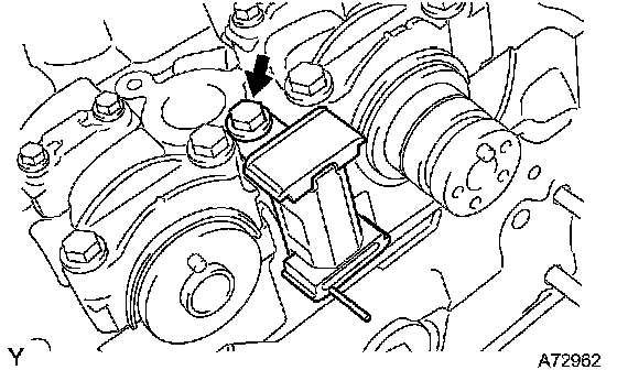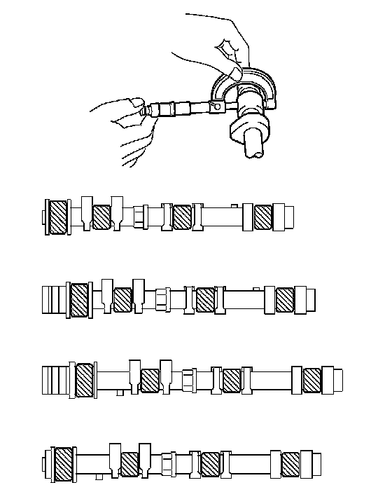 NOTICE: As the thrust clearance of the camshaft is small, the camshaft must be kept level while it is being removed. If the camshaft is not kept level, the portion of the cylinder head which receives the shaft thrust may crack or be damaged, causing the camshaft to seize or break. To avoid this, the following steps should be carried out.