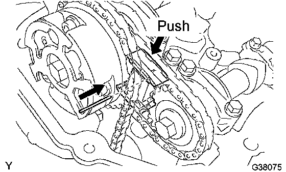 a. While pushing down the chain tensioner No.3, insert a pin of [diameter]1.0 mm (0.039 inch) into the hole to fix it.