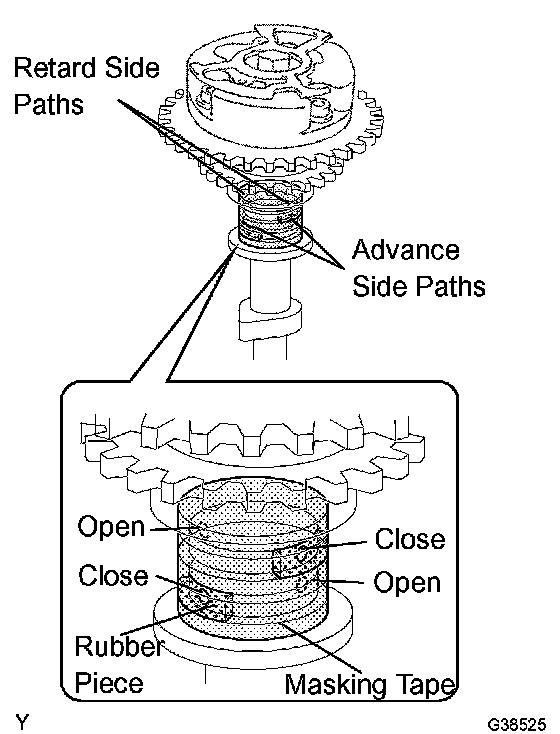 4 Confirm that the camshaft timing gear assembly rotates in the advance direction when reducing the air pressure applied to the retard path.