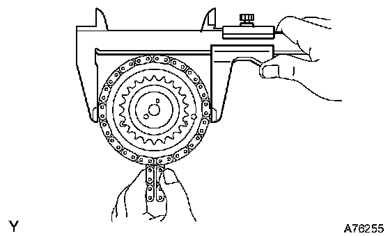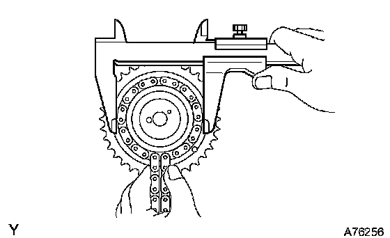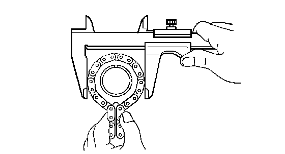 b. Using vernier calipers, measure the camshaft timing gear diameter with the chain.