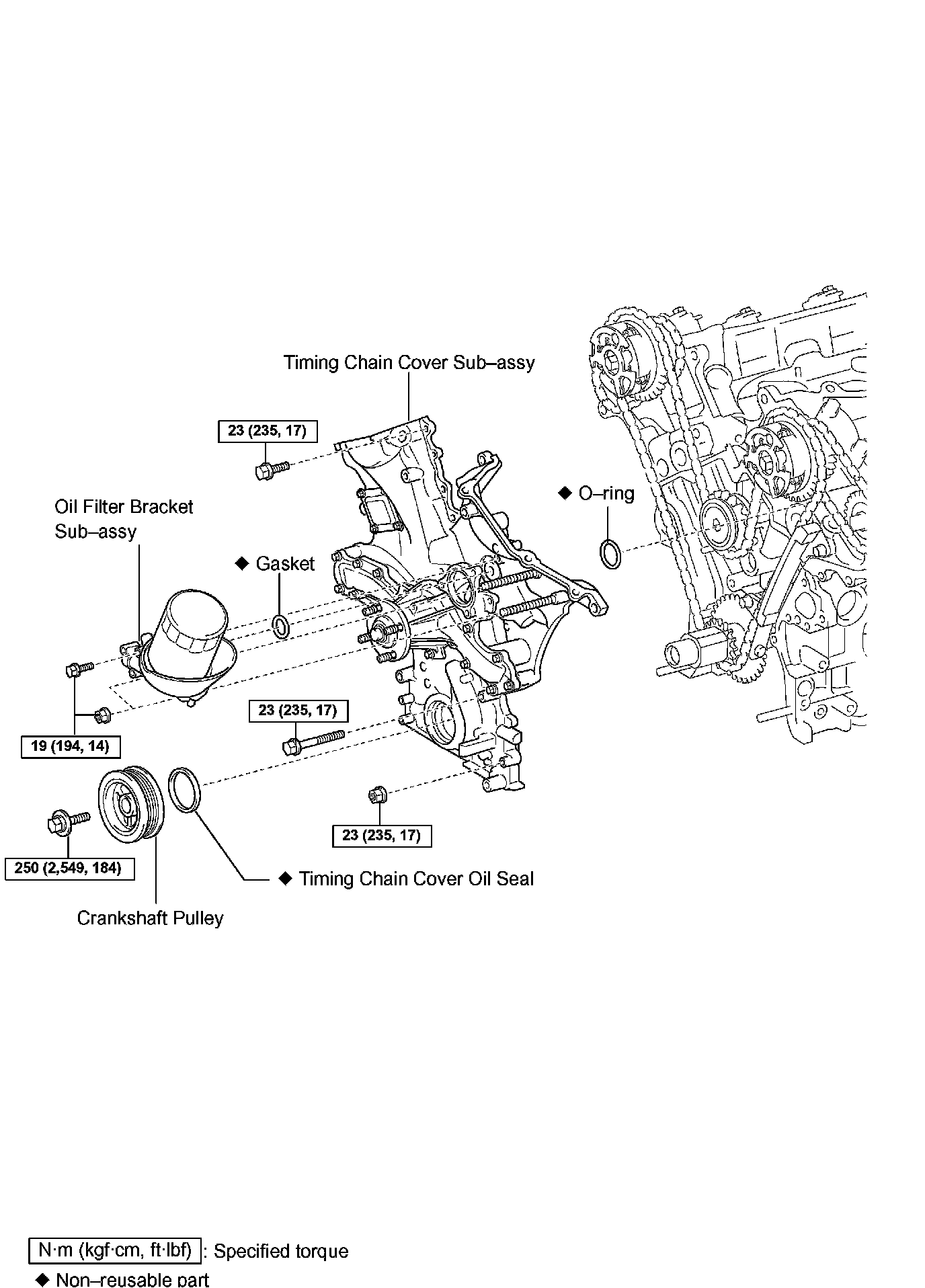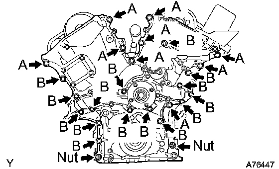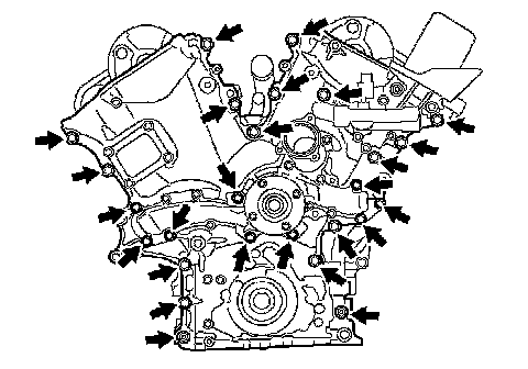 ^ Install the timing chain cover within 3 minutes after applying seal packing. After installing it, the timing chain cover bolts and nuts must be tightened within 15 minutes. Otherwise the seal packing must be removed and reapplied.