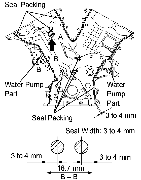 d. Apply a continuous bead of the seal packing (diameter: 3 to 4 mm (0.12 to 0.16 inch)) to the timing chain cover as shown in the illustration.