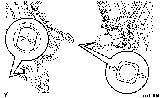 e. Align the key way of the oil pump drive rotor with the rectangular portion of the crankshaft timing gear, and slide the timing chain cover into place.