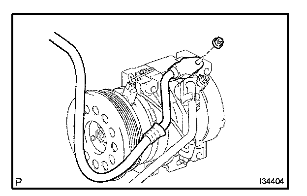 d. Install the discharge hose sub-assembly on the compressor and magnetic clutch with the nut.