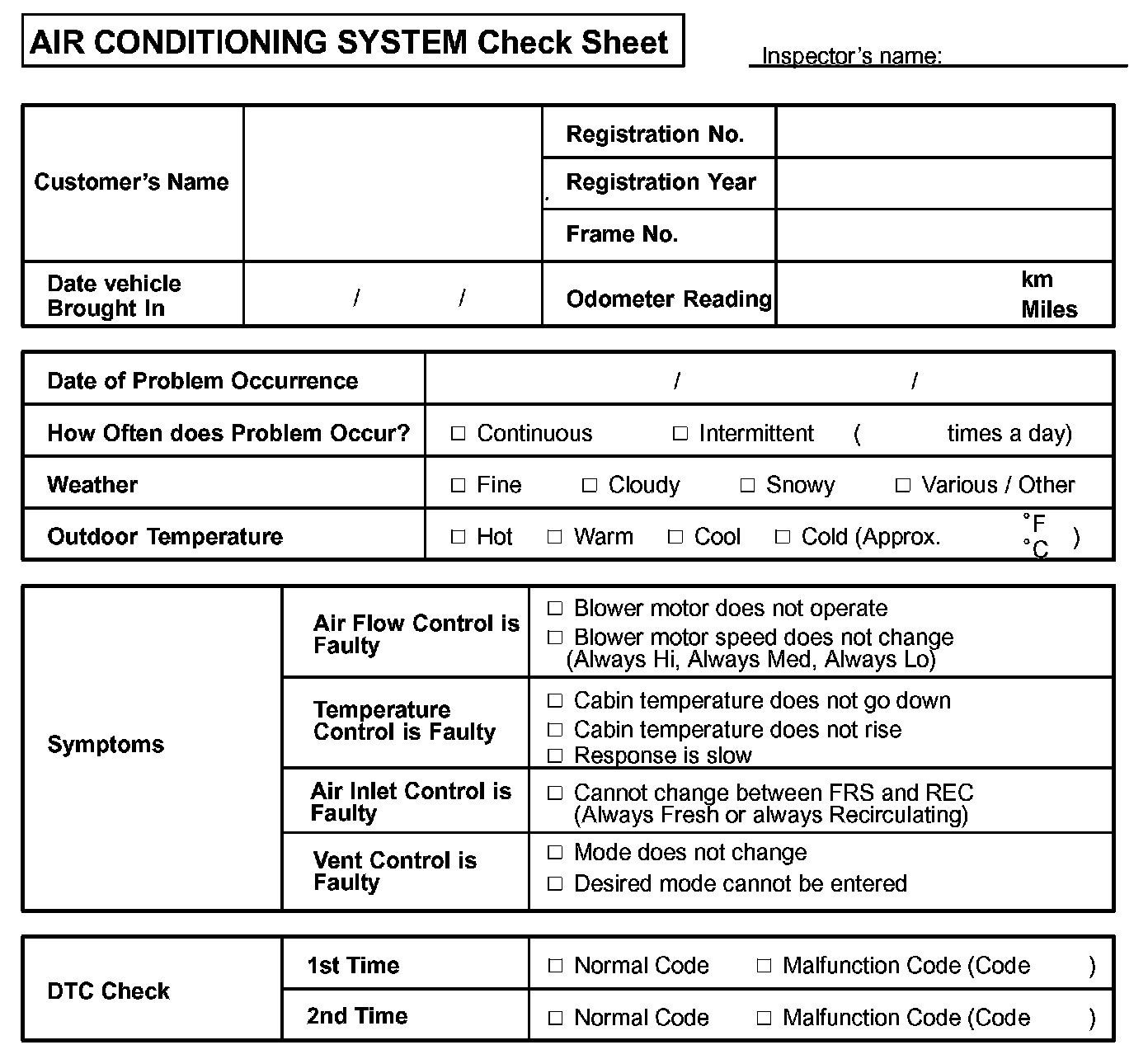 Air Conditioning System Check Sheet: