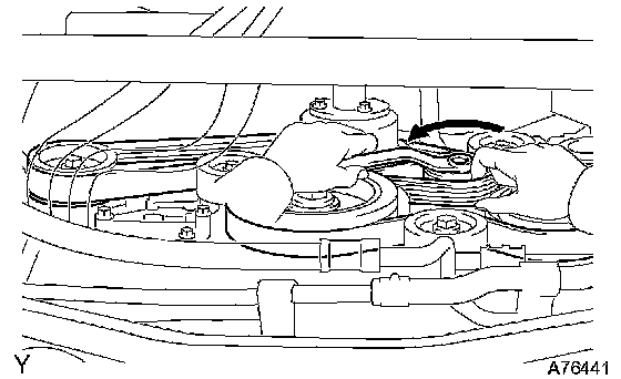 2 While releasing the belt tension by turning the belt tensioner counterclockwise, put the V-ribbed belt on the P/S pump.