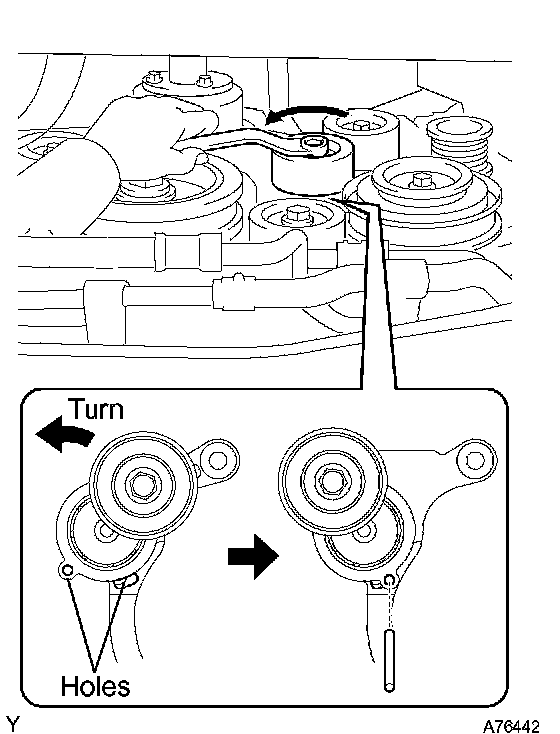 a. While turning the belt tensioner counterclockwise, align with the holes. Insert a bar of 6 mm (0.24 inch) into the holes to fix the belt tensioner.