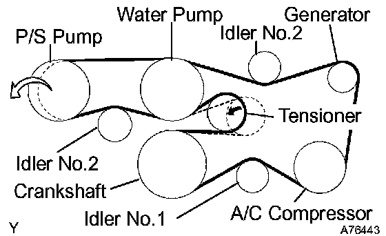 1 Put the V-ribbed belt on every part except the P/S pump as shown in the illustration.