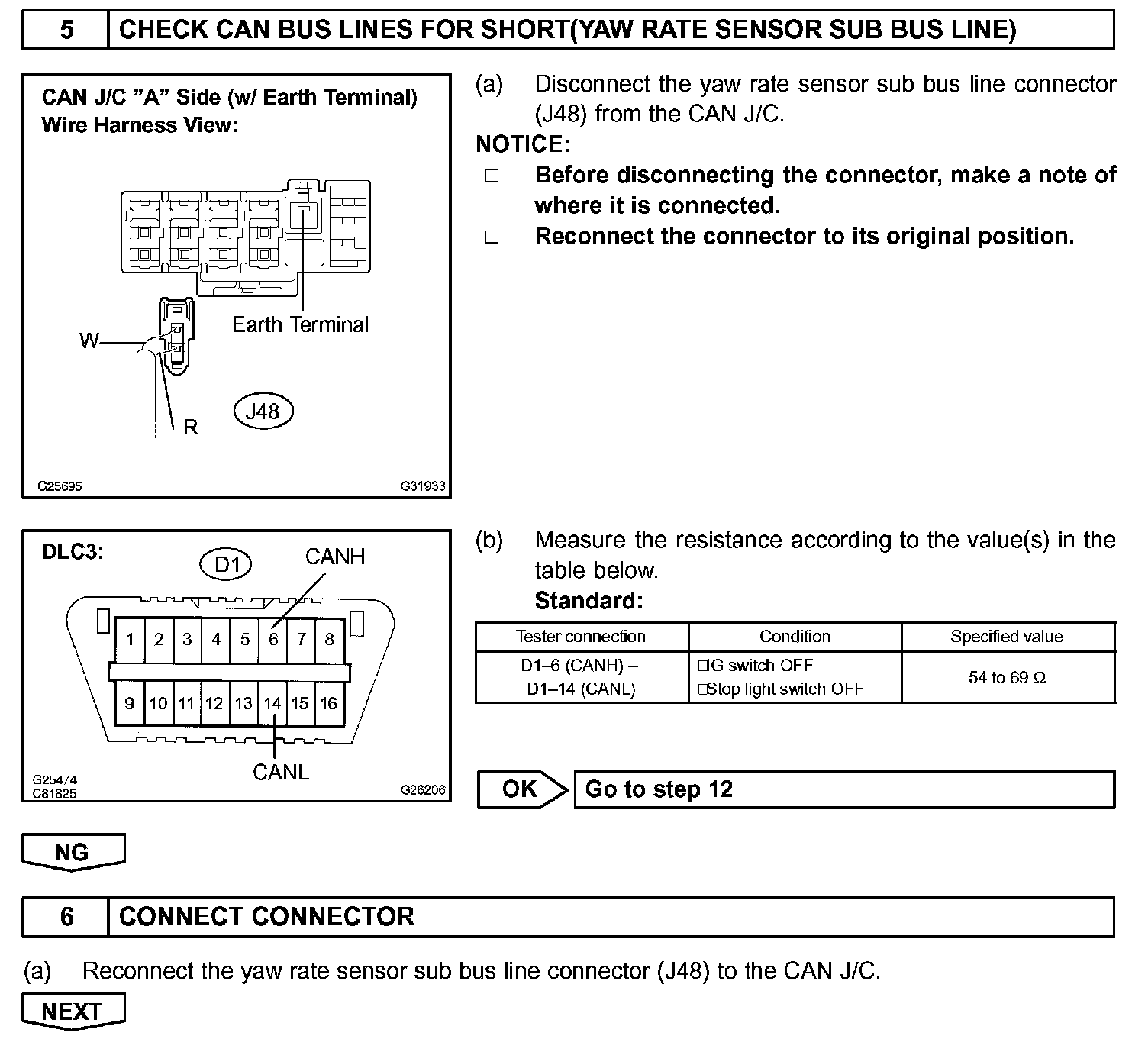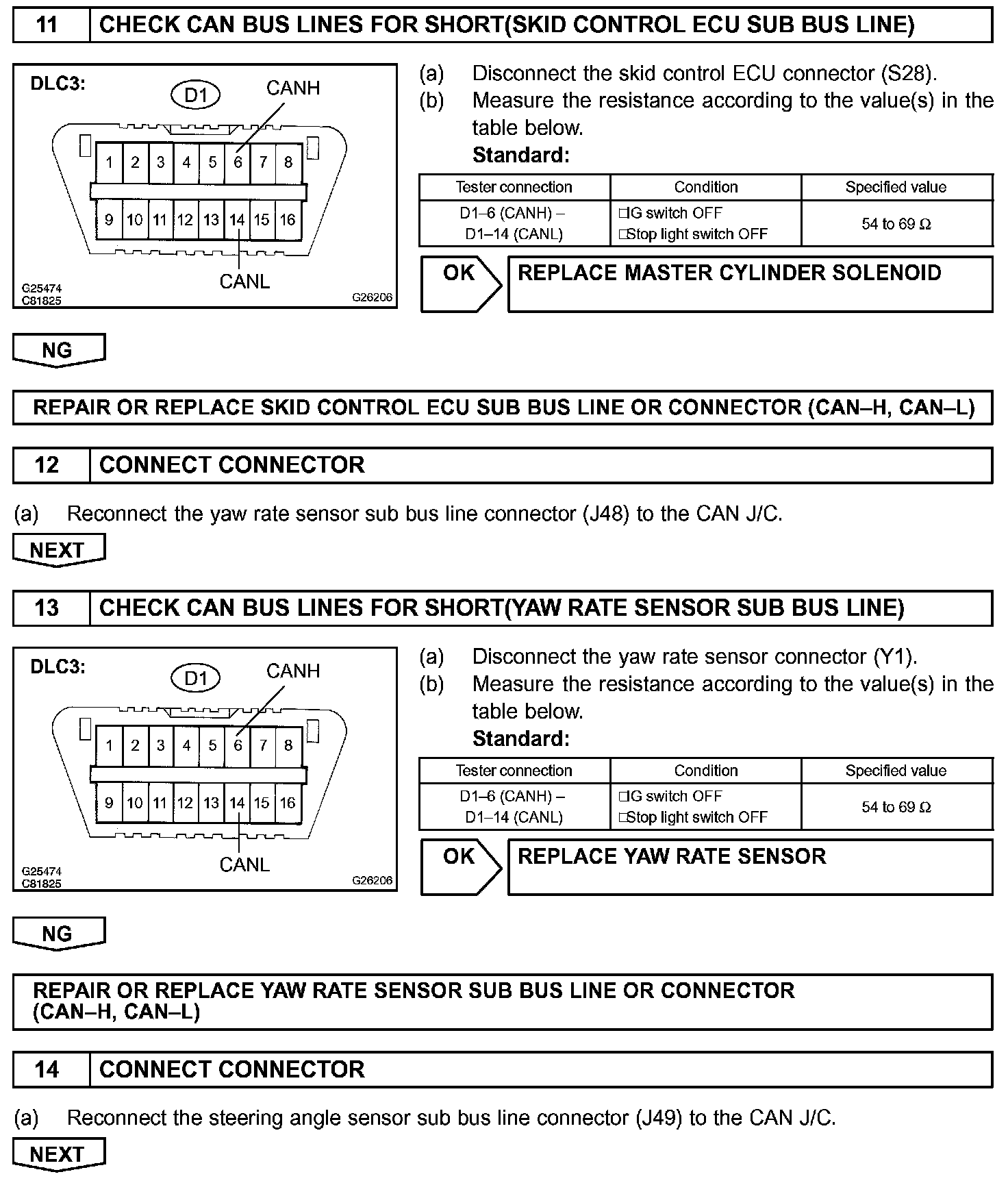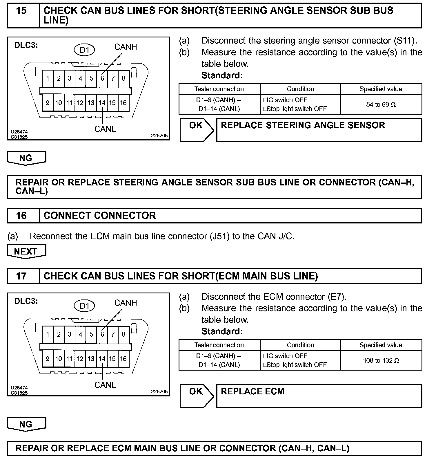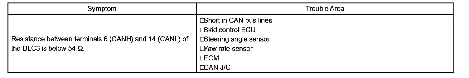 The CAN bus lines are considered to be shorted when the resistance between terminals 6 (CANH) and (CANL) of the DLC3 is below 54 Ohm.