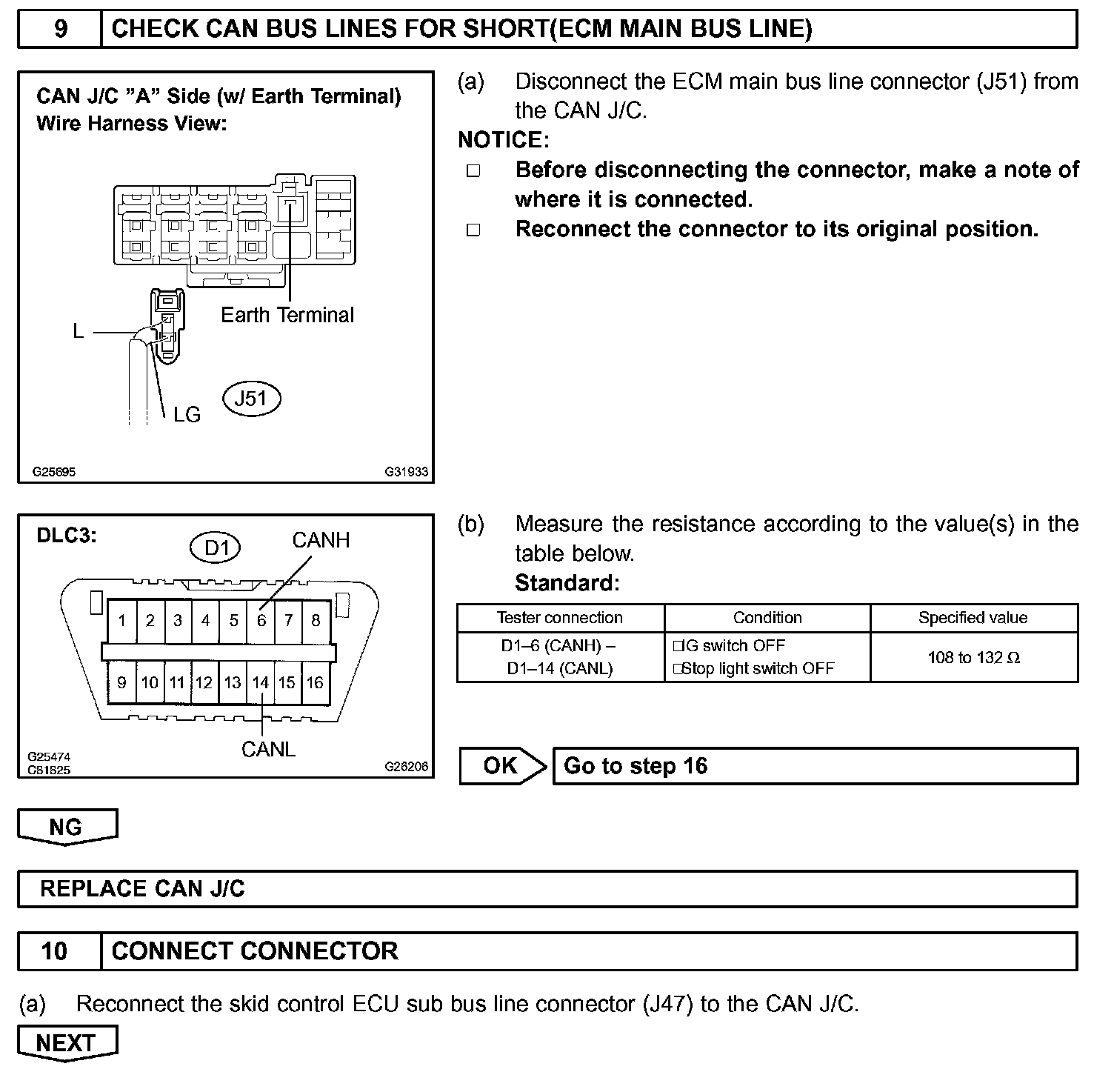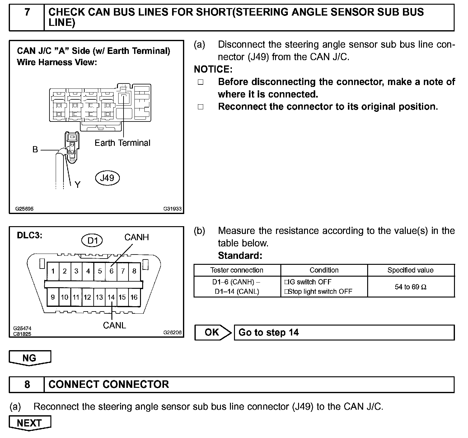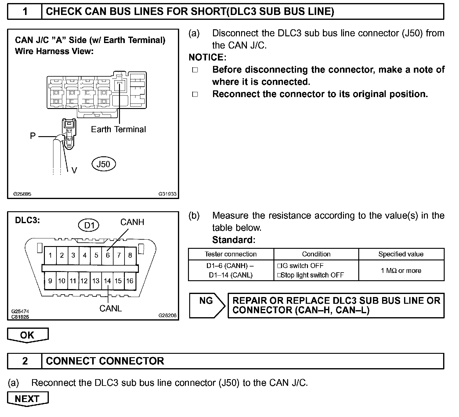 The CAN bus lines are considered to be shorted when the resistance between terminals 6 (CANH) and (CANL) of the DLC3 is below 54 Ohm.