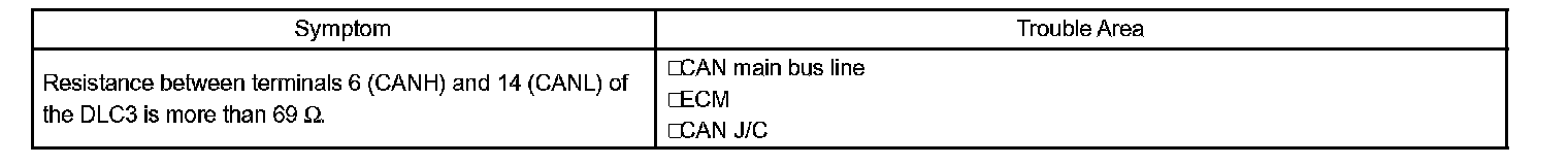 The CAN main bus line and DLC3 sub bus line may have a disconnection when the resistance between terminals 6 (CANH) and 14 (CANL) of the DLC3 is more than 69 Ohm.