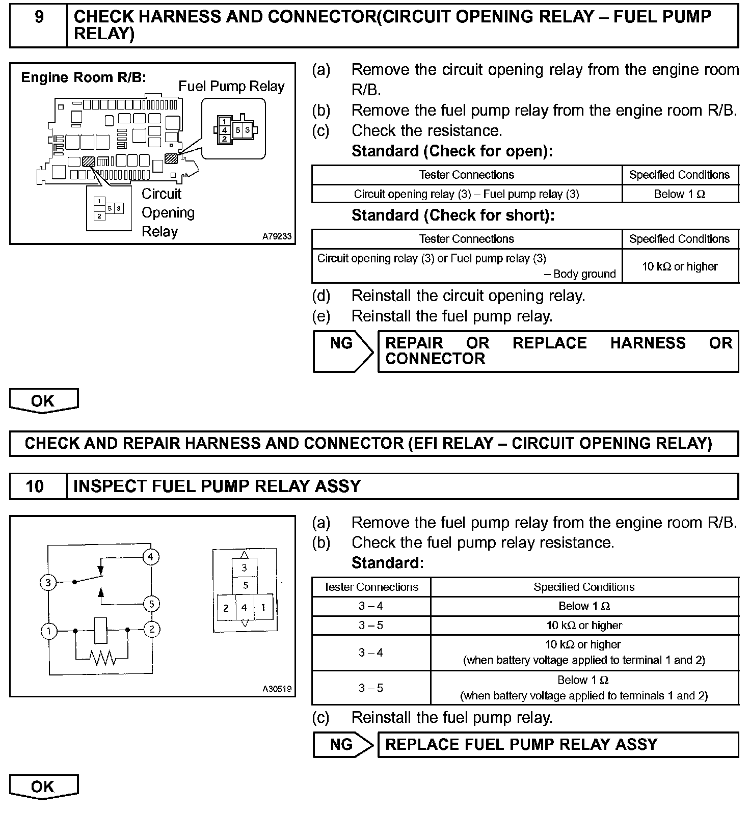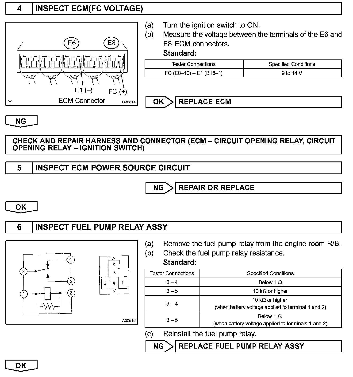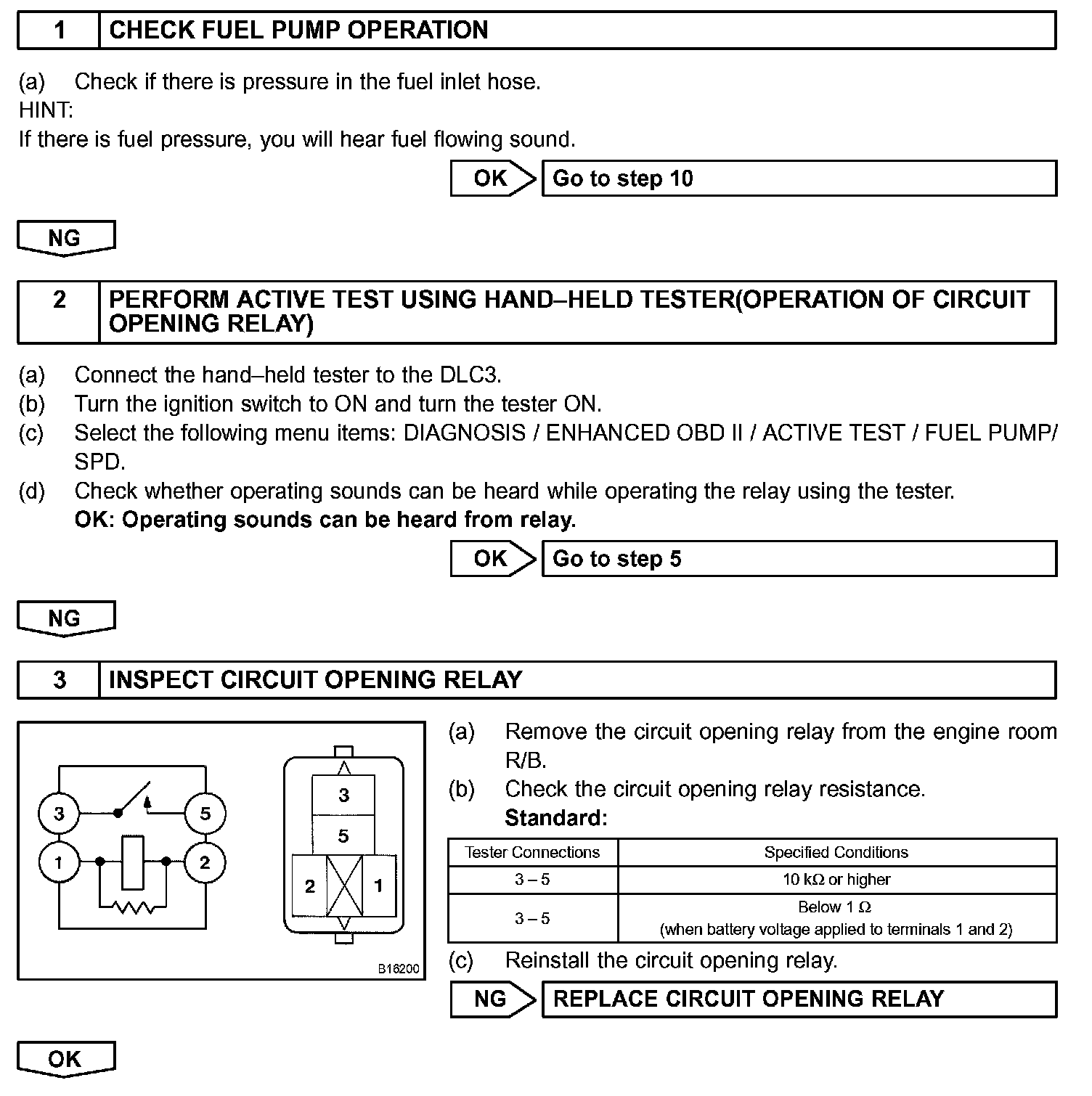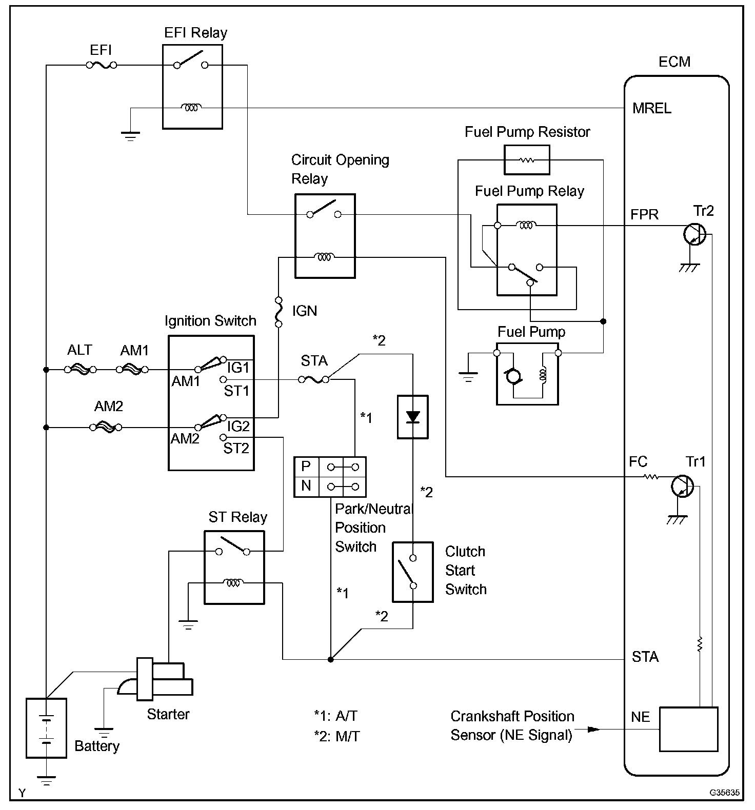 When the STA signal and NE signal are input to the ECM, Tr1 (power transistor 1) is turned ON, current flows to the coil of the circuit opening relay, the relay switches on, power is supplied to the fuel pump, and the fuel pump operates.