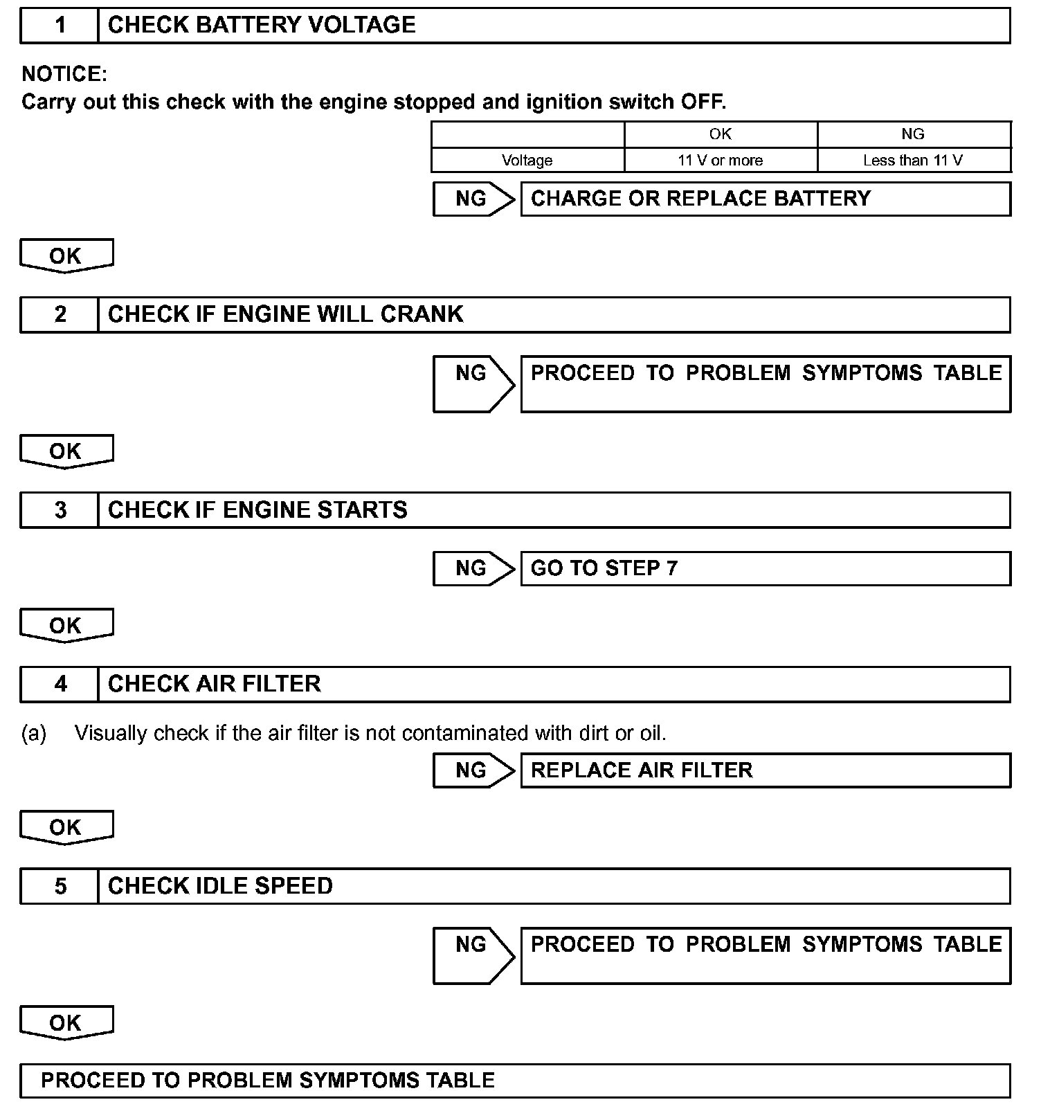 When the malfunction is not confirmed in the DTC check, troubleshooting should be carried out in all the possible circuits considered as causes of the problem. In many cases, by carrying out the basic engine check shown in the flowchart, the location causing the problem can be found quickly and efficiently. Therefore, using this check is essential in the engine troubleshooting.