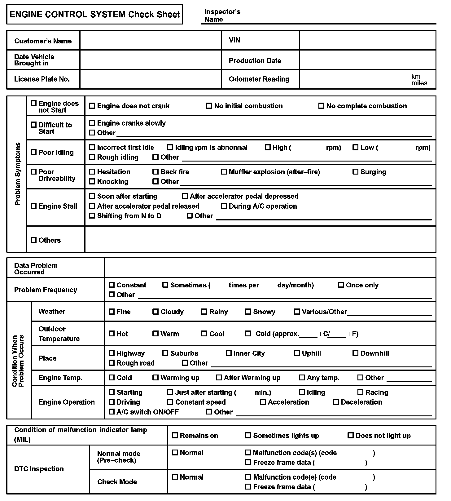 Engine Control System Check Sheet: