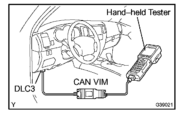 Since the CAN communication is equipped in this system, CAN VIM (VIM: Vehicle Interface Module) connecting with hand-held tester is necessary to display any information from the ECM on the tester. (Also the communication between the hand-held tester and the ECM uses CAN communication signal) When confirm the DTCs and any data of the ECM, connect the CAN VIM between the DLC3 and the hand-held tester.