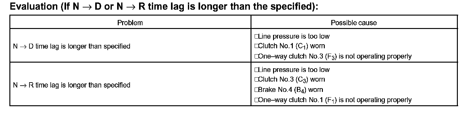 1. When the shift lever is shifted while the engine is idling, there will be a certain time lapse or lag before the shock can be felt. This is used for checking the condition of the direct clutch, forward clutch, and 1st and reverse brake.