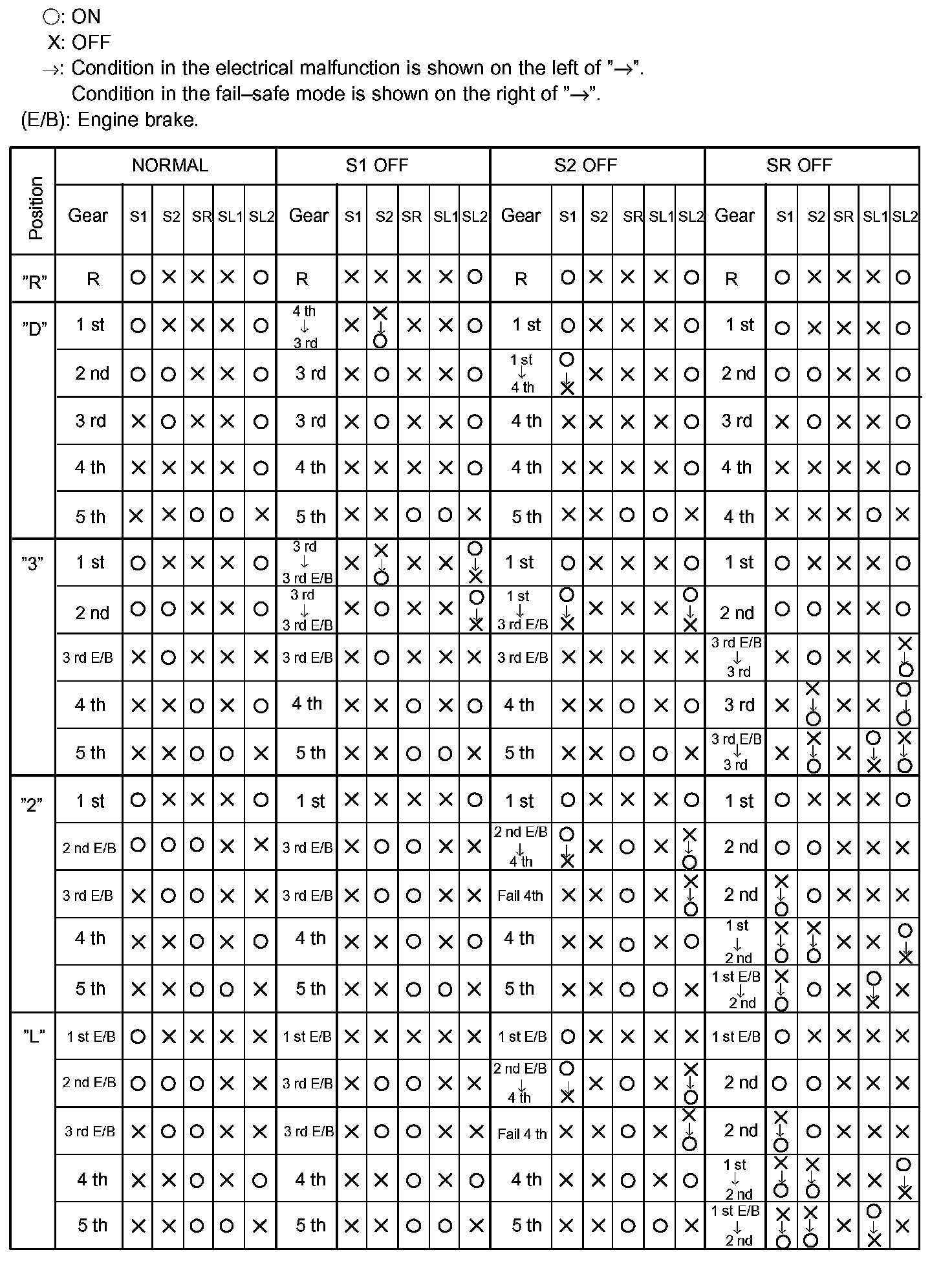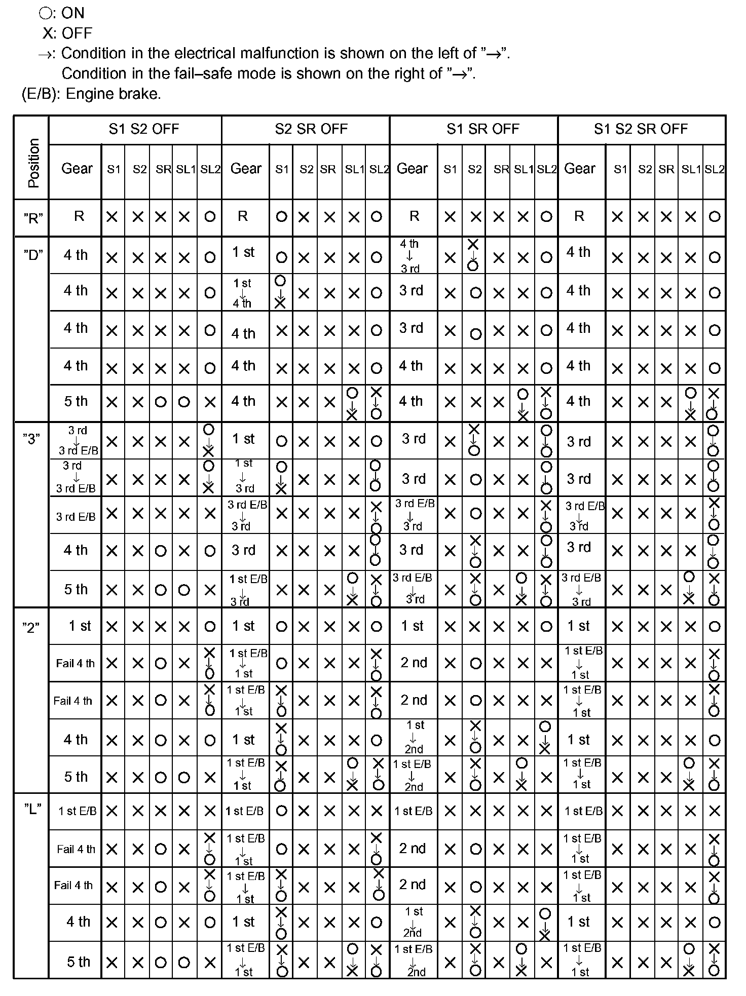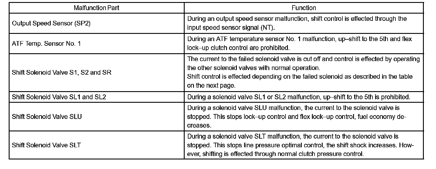If either of the shift solenoid valve circuits has an open or short failure, the ECM turns the other shift solenoid "ON" and "OFF" in order to shift into the gear positions shown in the table.