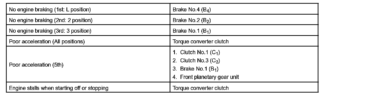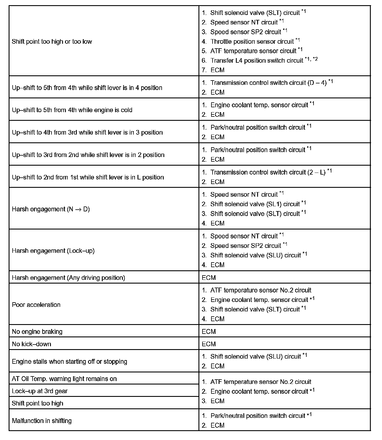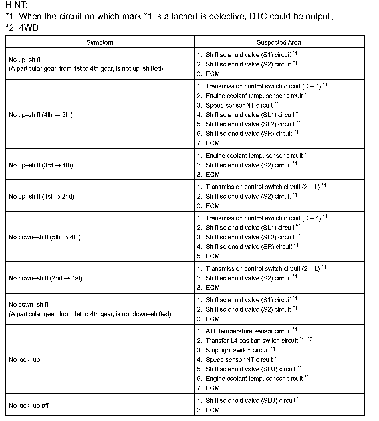 PROBLEM SYMPTOMS TABLEHINT: If a normal code is displayed during the diagnostic trouble code check although the trouble still occurs, check the electrical circuits for each symptom in the order given in the charts and proceed to the given troubleshooting.