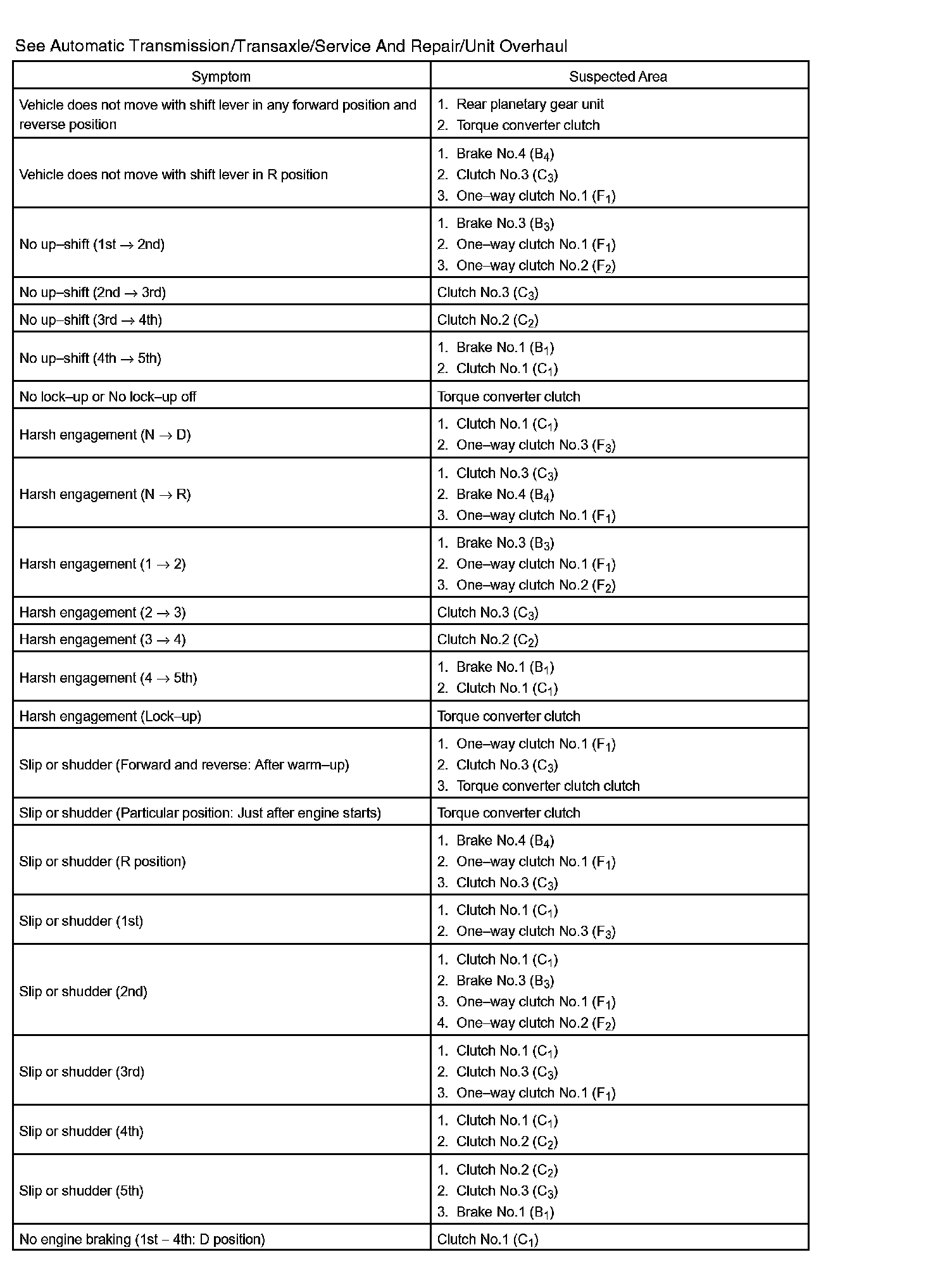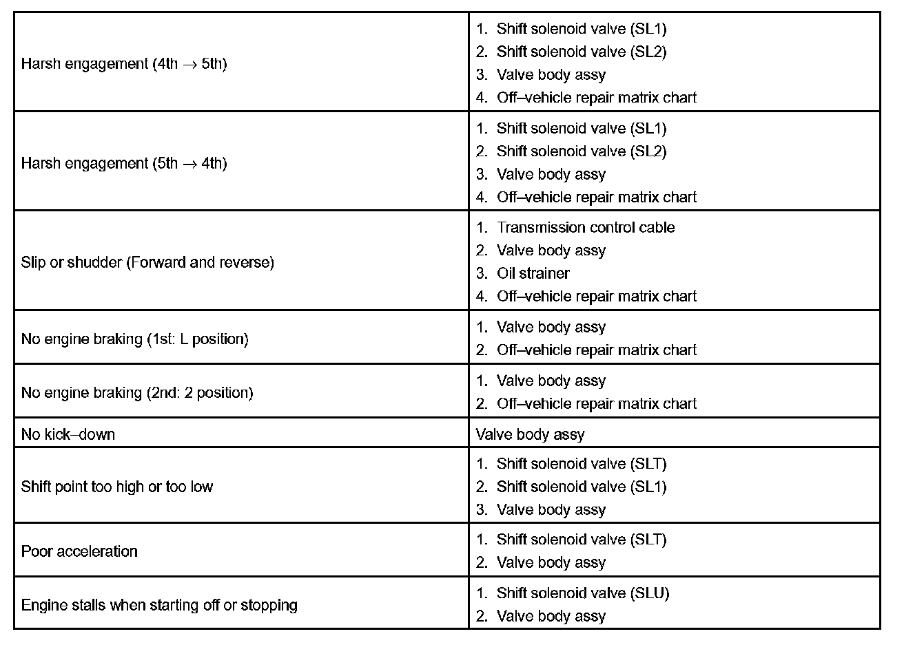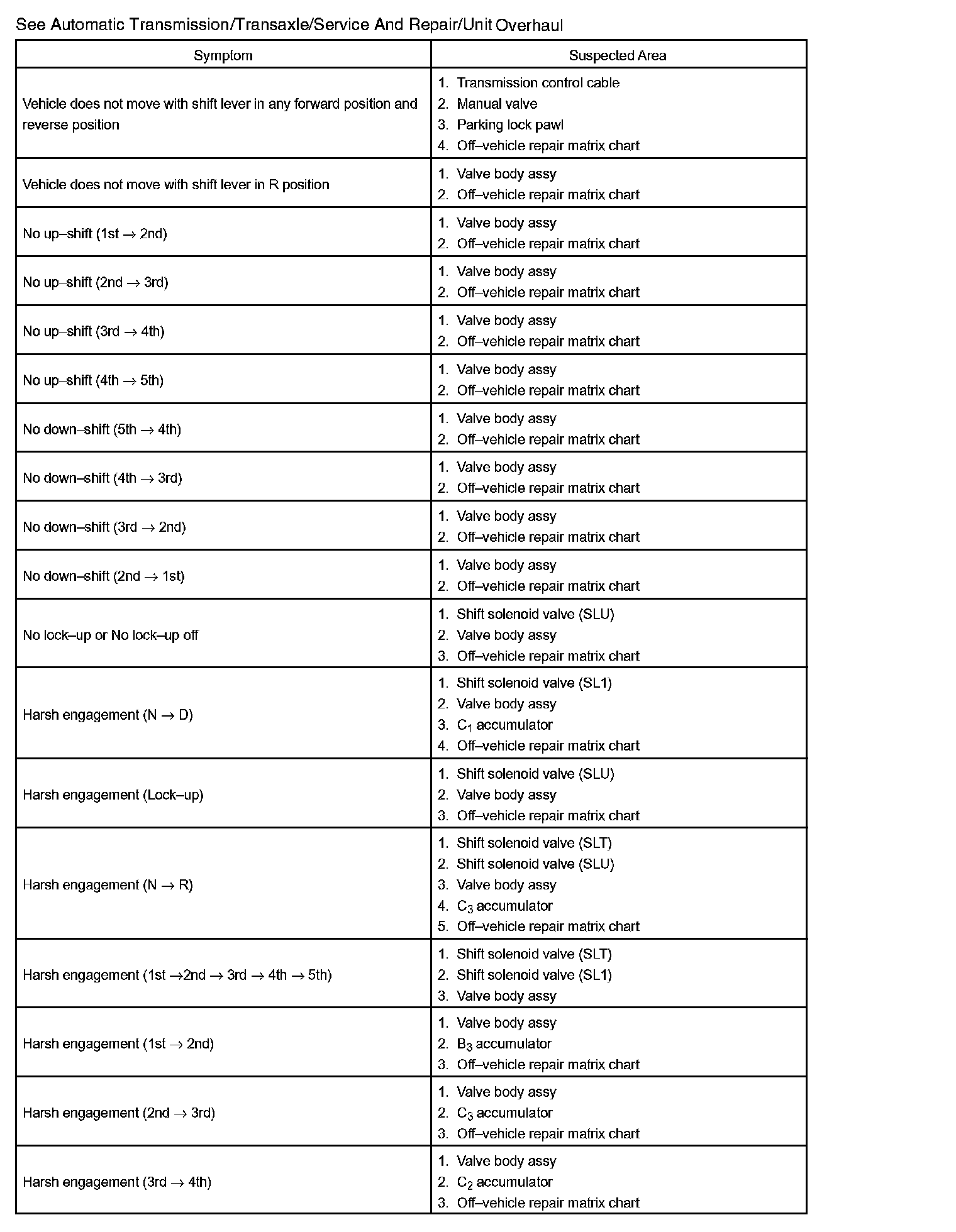 PROBLEM SYMPTOMS TABLEHINT: If a normal code is displayed during the diagnostic trouble code check although the trouble still occurs, check the electrical circuits for each symptom in the order given in the charts and proceed to the given troubleshooting.