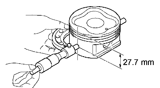Using a micrometer, measure the piston diameter at right angles to the piston pin center line, 27.7 mm (1.091 inch) from the piston head.