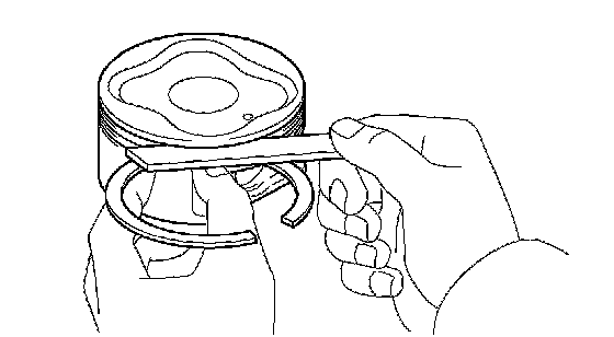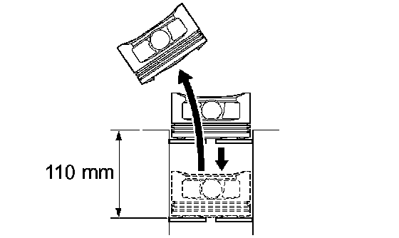 Using a piston, push the piston ring a little beyond the bottom of the ring travel, 110 mm (4.33 inch) from the top of the cylinder block.