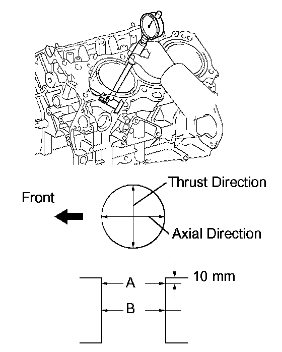 Using a cylinder gauge, measure the cylinder bore diameter at positions A and B in the thrust and axial directions.