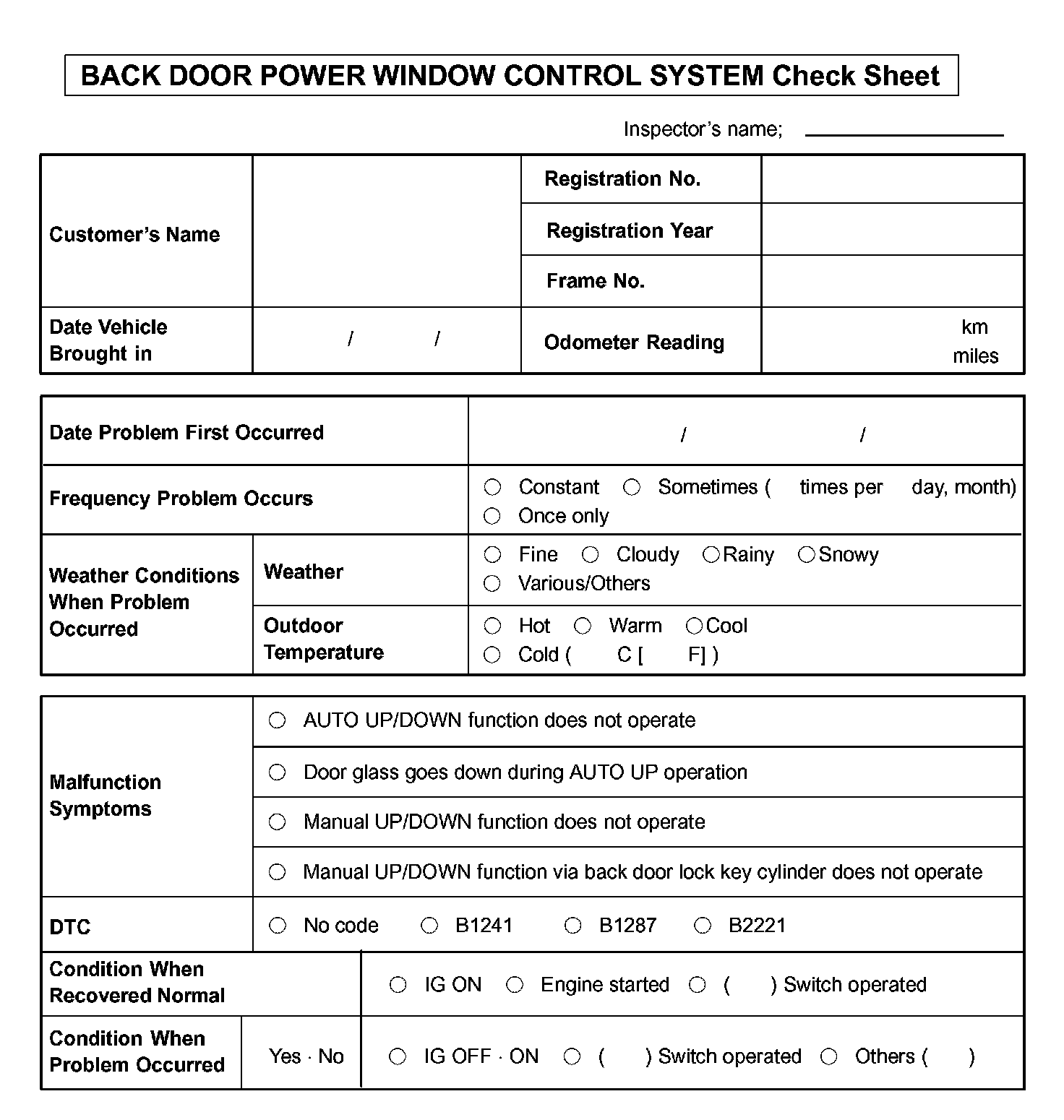 Back Door Power Window Control System Check Sheet: