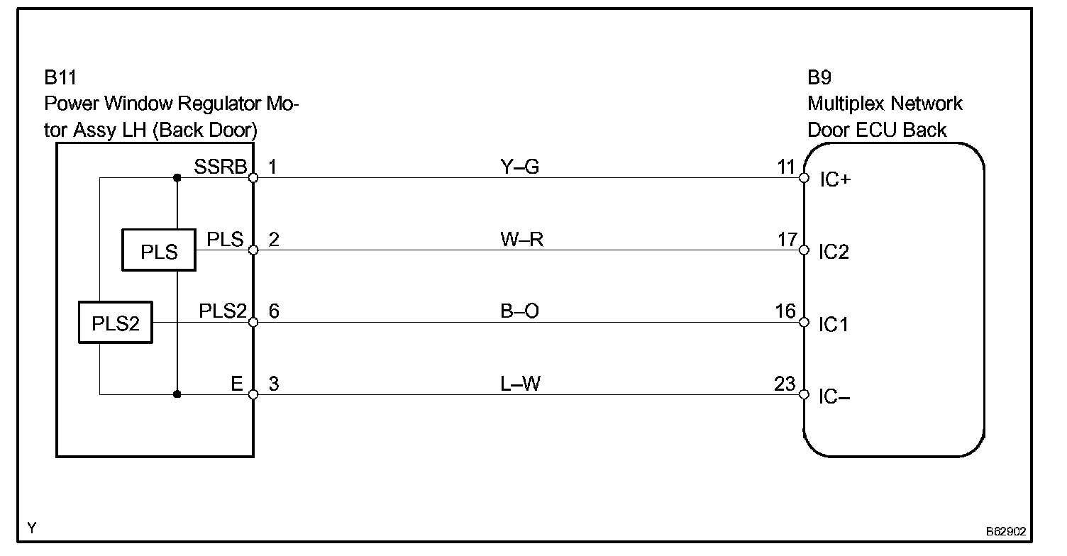 The back door ECU monitors the condition of the power window motor and detects the position of the door glass by using pulse signals output from the 2 pulse sensors in the power window motor.