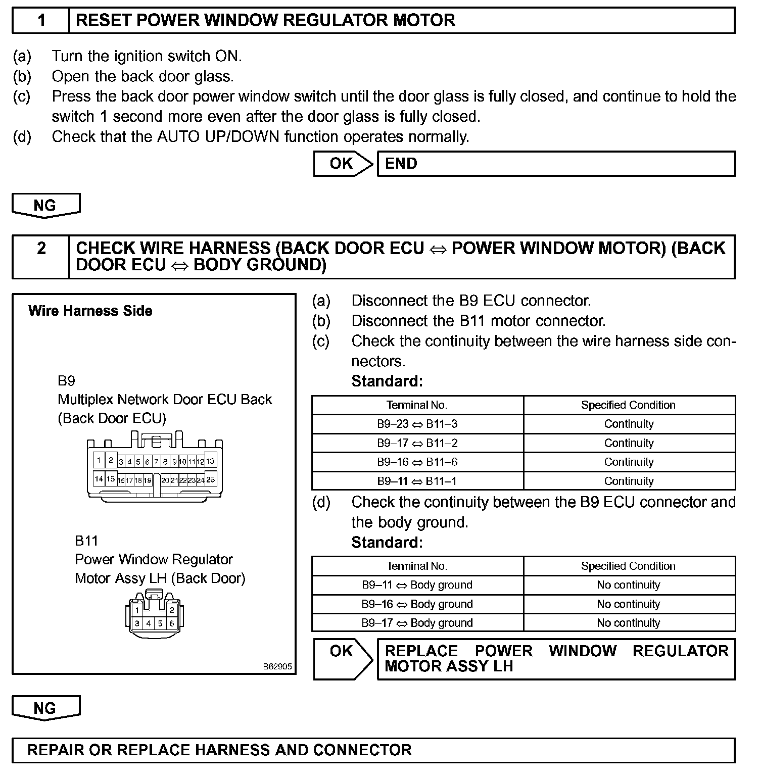 If the pulse sensor in the back door power window motor malfunctions (DTC B2221 is output), the power window functions will be restricted: