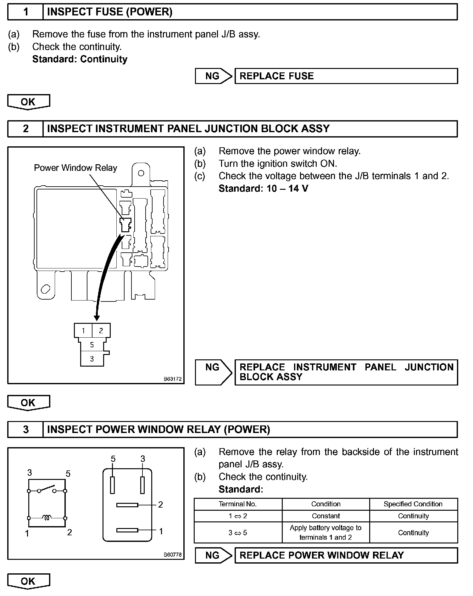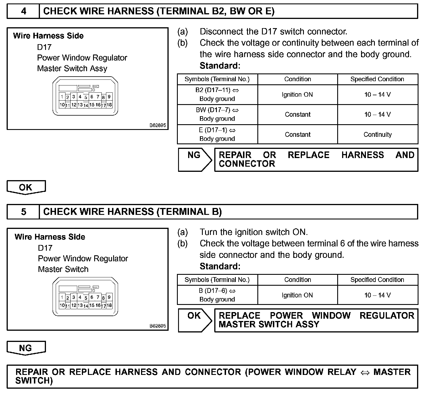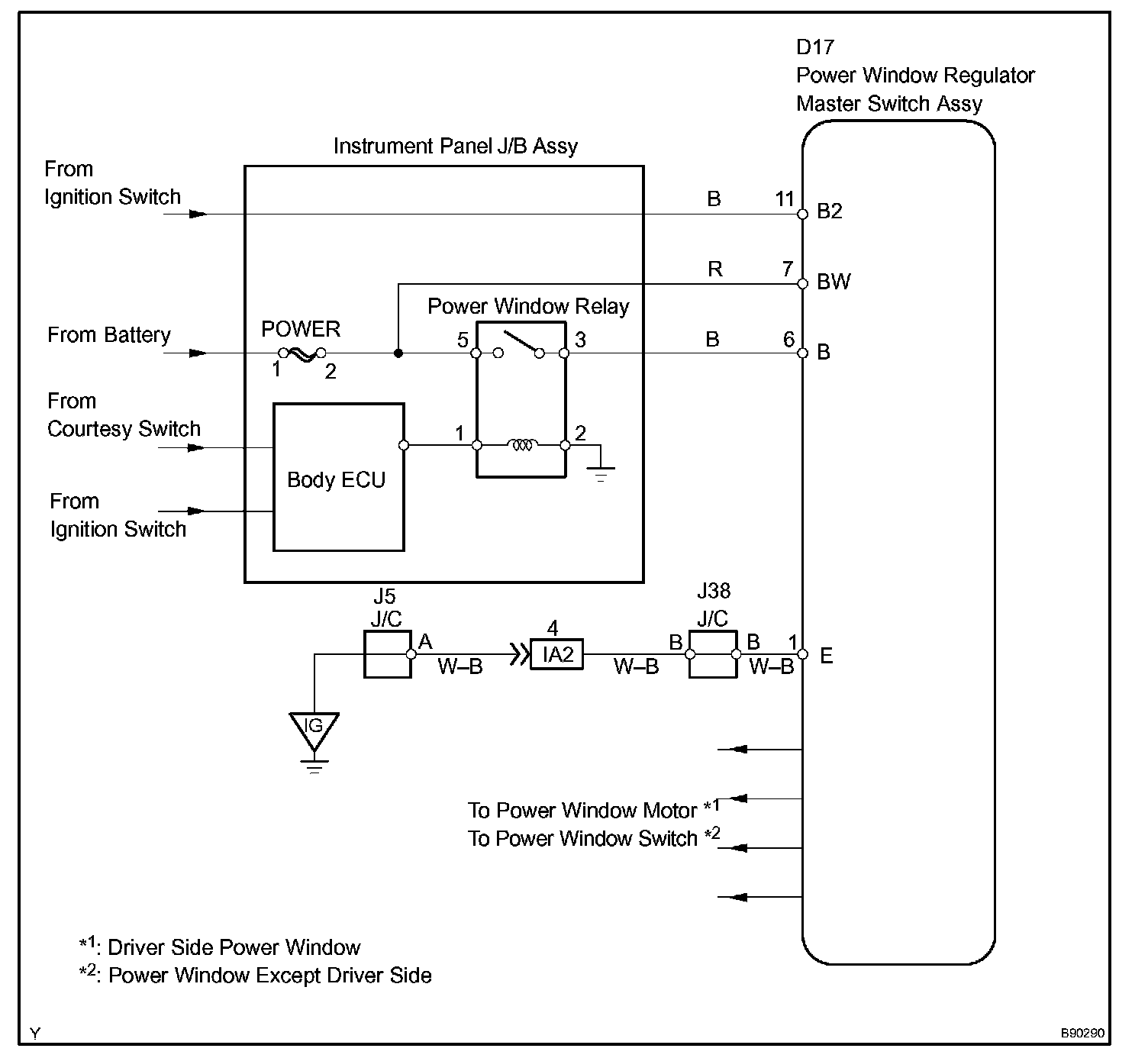 If all the door glasses do not operate or if the operation function after the ignition switch is turned OFF does not operate, no power may be supplied to the power window master switch or the power window master switch itself may malfunction.