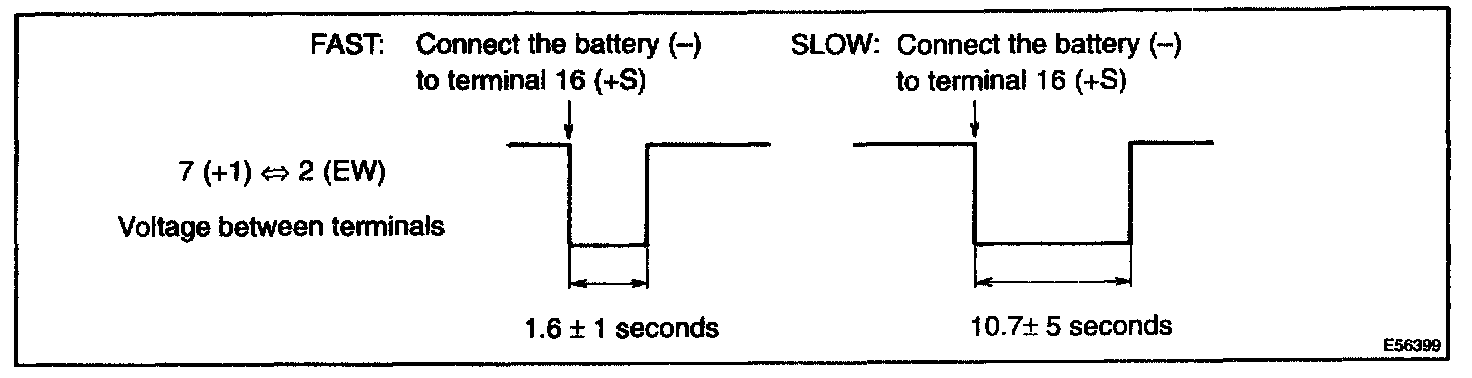 5. Connect the battery (-) to terminal 16 (+S) of the connector. Operate the intermittent wiper relay and check voltage between terminal 7 (+1) and terminal 2 (EW).