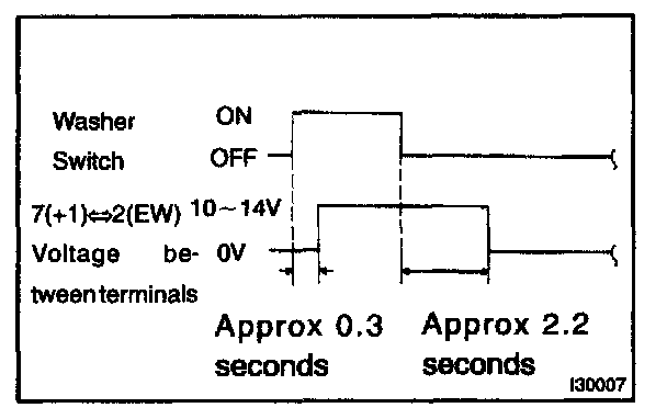 3. Connect the voltmeter (+) terminal to terminal 7 (+1) of the connector and the voltmeter (-) terminal to terminal 2 (EW) of the connector. Turn the washer switch to ON and OFF, and check voltage between terminal 7 (+1) and terminal 2 (EW).