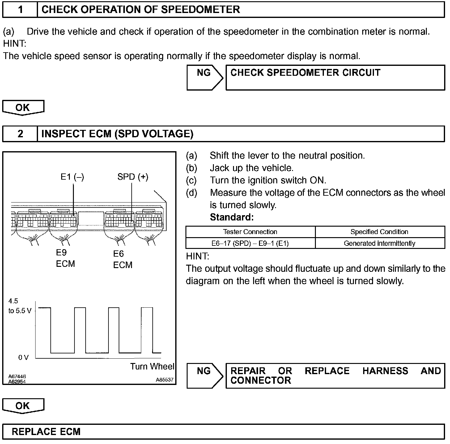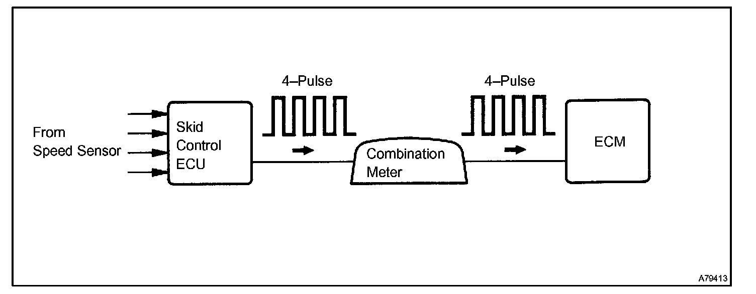 The speed sensor detects the wheel speed and sends the appropriate signals to the skid control ECU. The skid control ECU converts these wheel speed signals into a 4-pulse signal and outputs it to the ECM via the combination meter. The ECM determines the vehicle speed based on the frequency of these pulse signals.