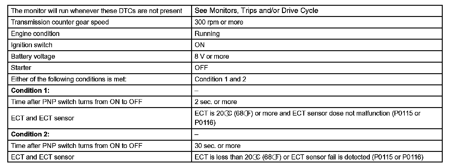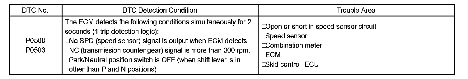 The ECM assumes that the vehicle is being driven when the transmission counter gear indicates more than 300 rpm and over 30 seconds have passed since the park/neutral position switch was turned OFF. If there is no signal from the vehicle speed sensor with these conditions satisfied, the ECM concludes that the vehicle speed sensor is malfunctioning. The ECM will turn on the MIL and will set a DTC.