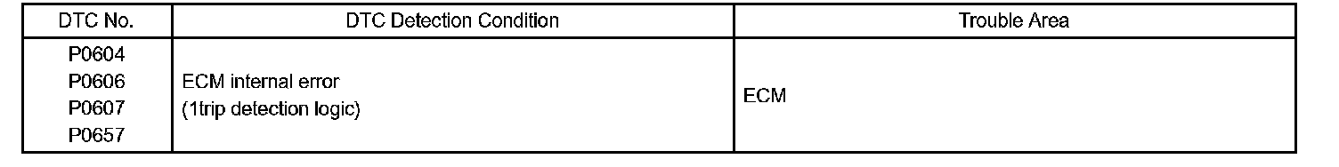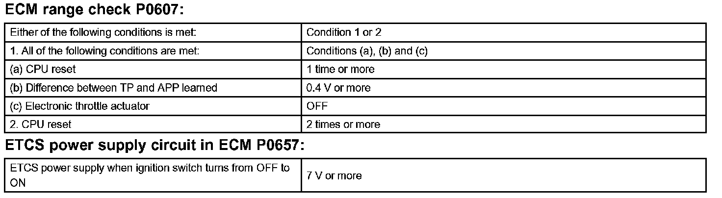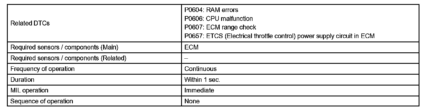 The ECM memory status is diagnosed by internal "mirroring" of the main CPU and the sub CPU to detect random access memory (RAM) errors. The two CPUs also perform continuous mutual monitoring. The ECM sets a DTC if: 1) outputs from the 2 CPUs are different and deviate from the standards, 2) the signals to the throttle actuator deviate from the standards, 3) a malfunction is found in the throttle actuator supply voltage, and 4) any other ECM malfunction is found.