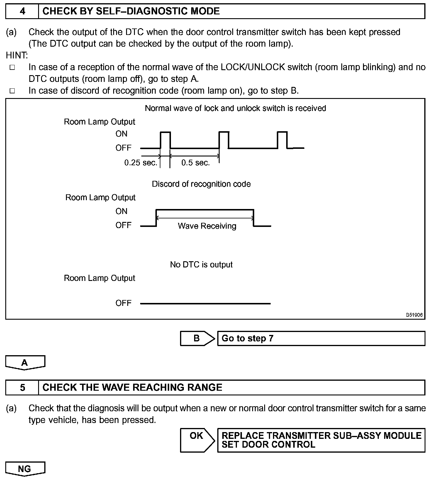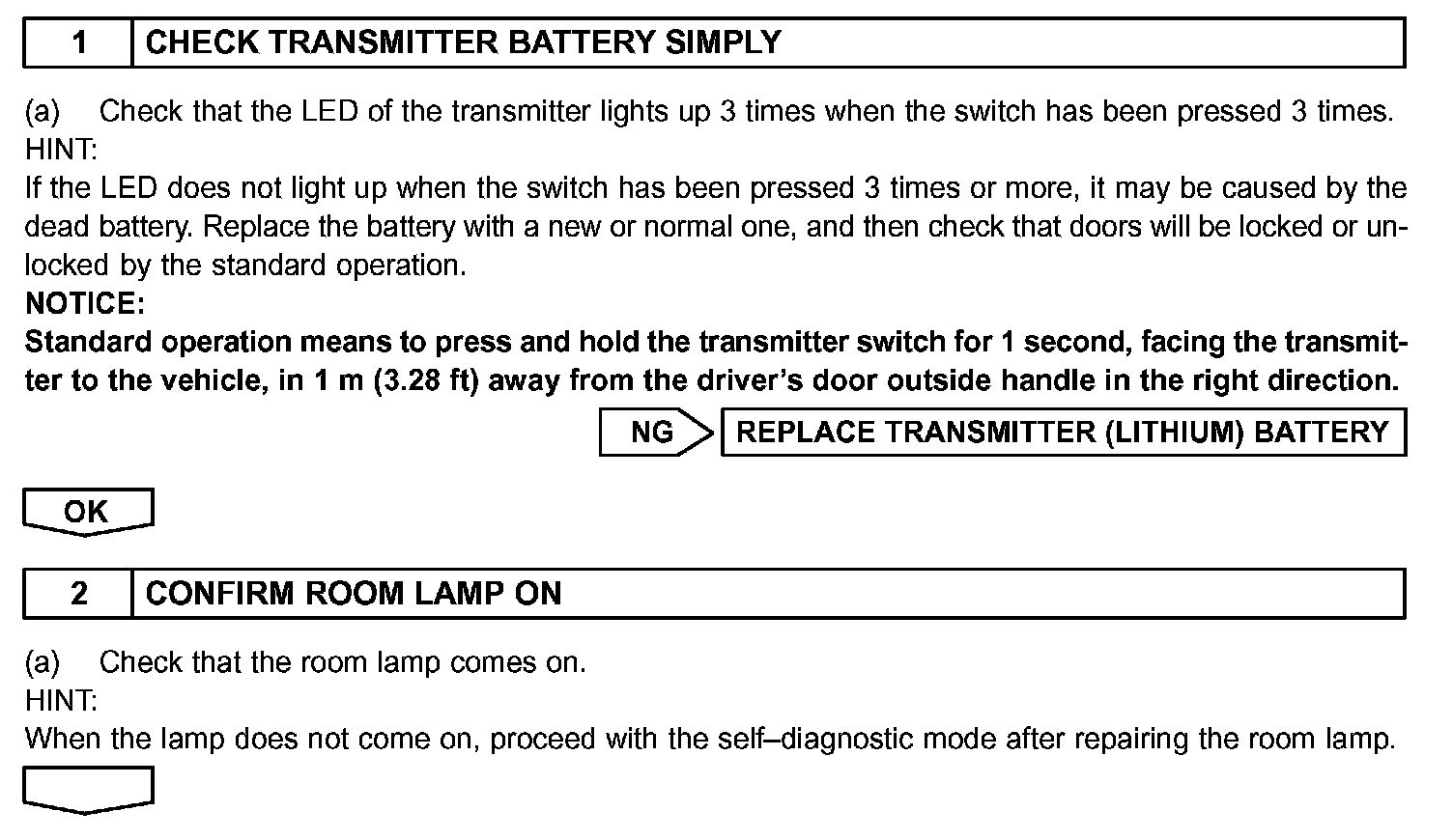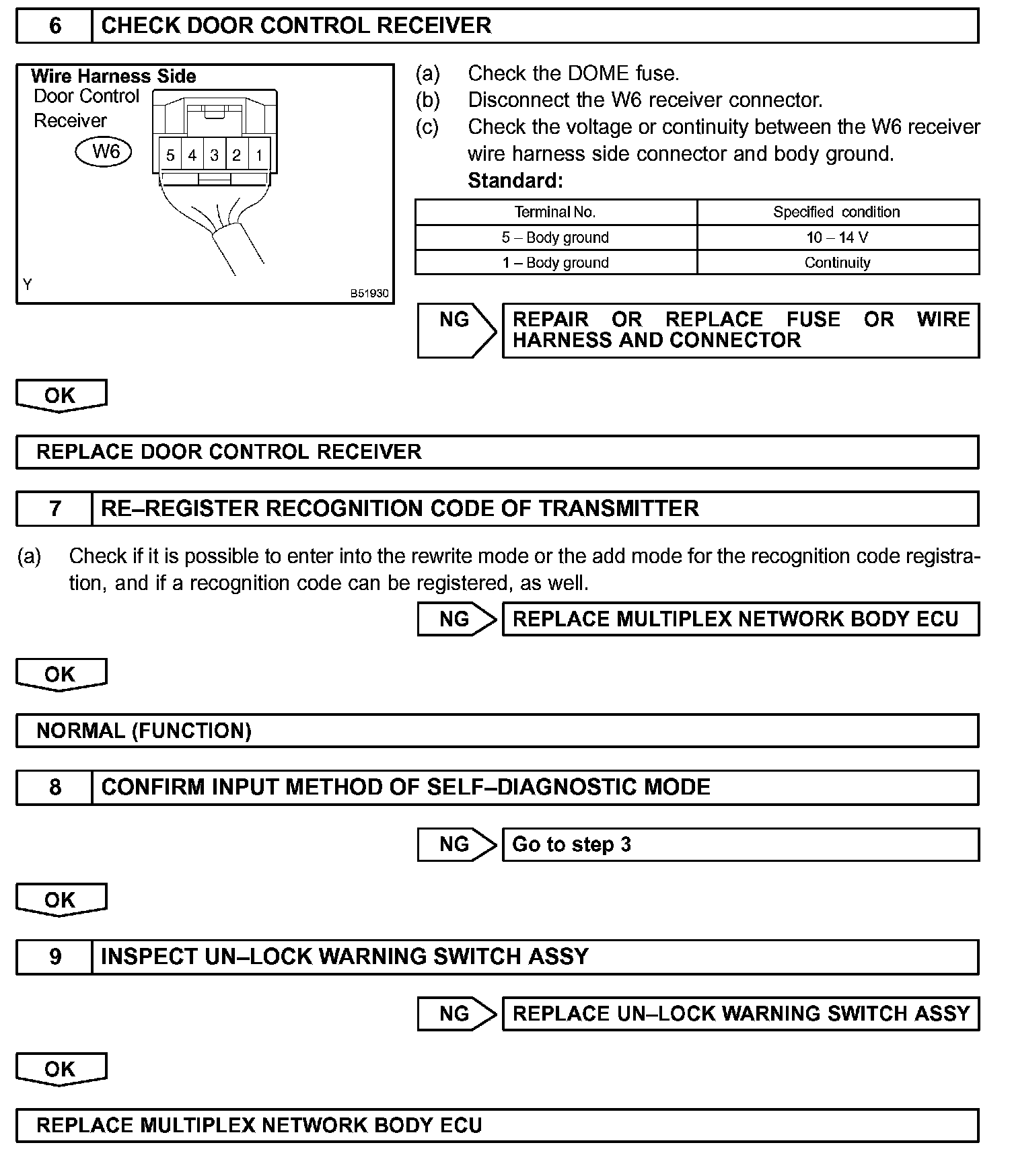 NOTE: The wireless door lock control system has a function with a large-scale multiplex communication system. First of all, inspect the communication function depending on the "HOW TO PROCEED WITH TROUBLESHOOTING", and check that the communication system has no malfunction. Then finally proceed with the troubleshooting. Also, in case that the wire harness between the body ECU and door control receiver has been short-circuited, diagnostic code 42 will be output and the wireless control will not function.