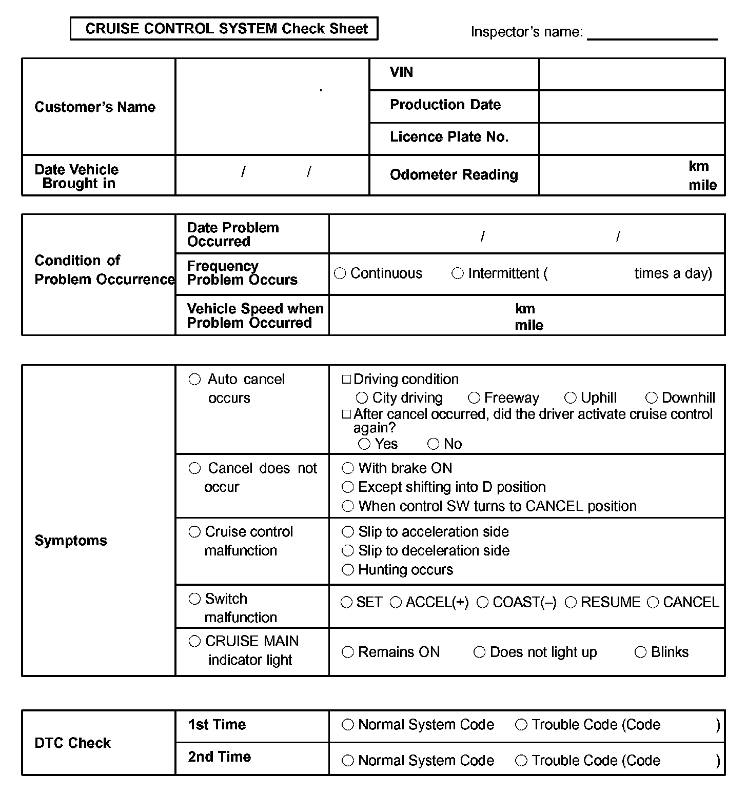 Cruise Control System Check Sheet: