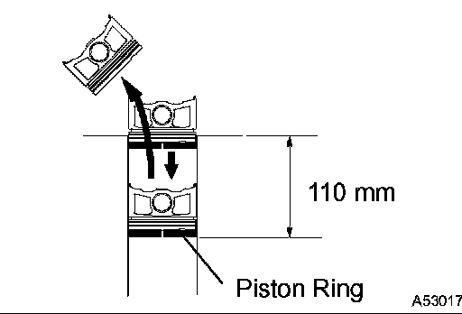 a. Using a piston, push the piston ring a little beyond the bottom of the ring travel, 110 mm (4.33 inch) from the top of the cylinder block.