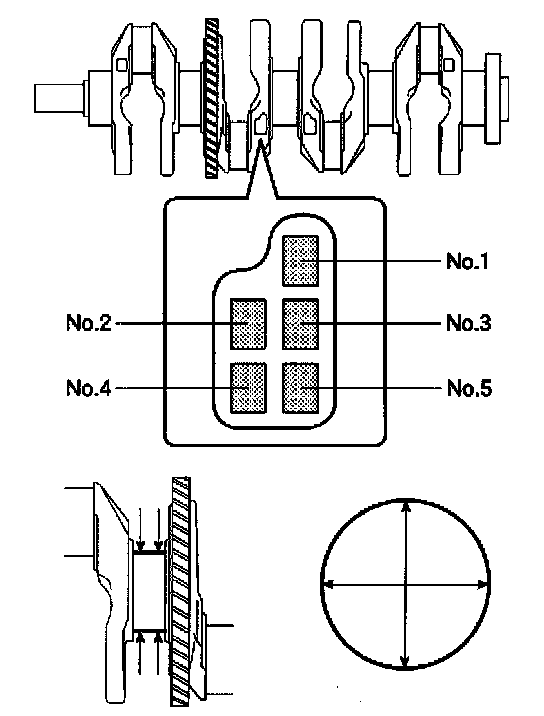 If the diameter is not as specified, check the oil clearance (see step 2). If necessary, replace the crankshaft.