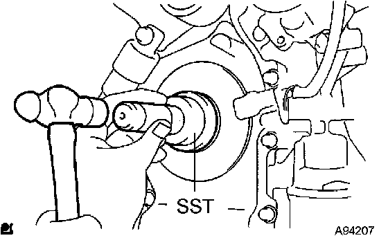 b. Using SST and a hammer, tap in the oil seal until its surface is flush with the rear oil seal retainer edge.
