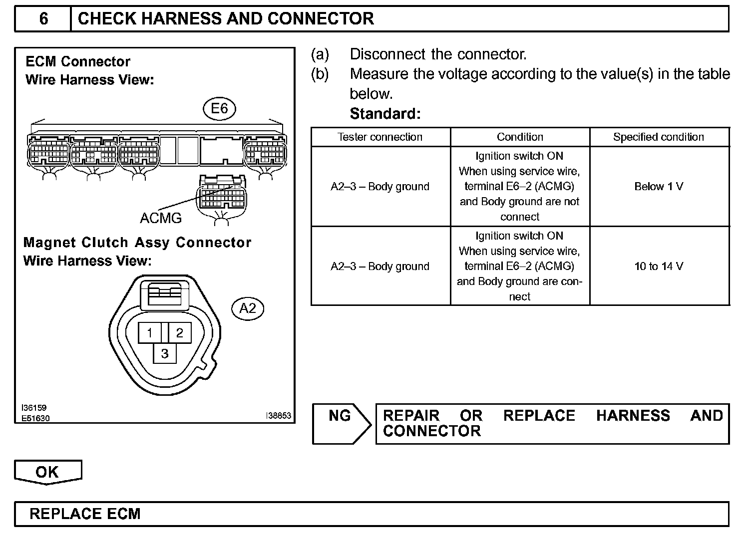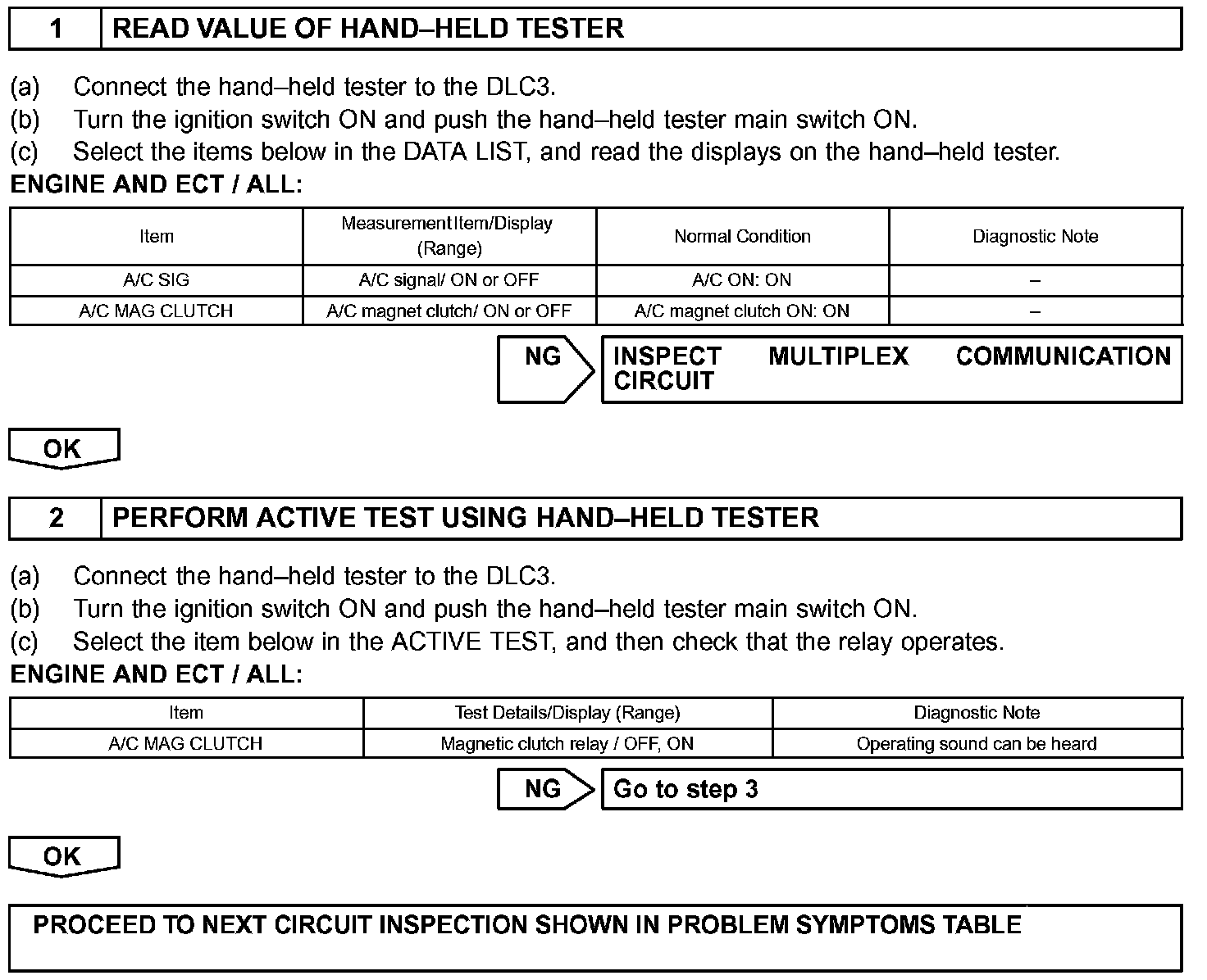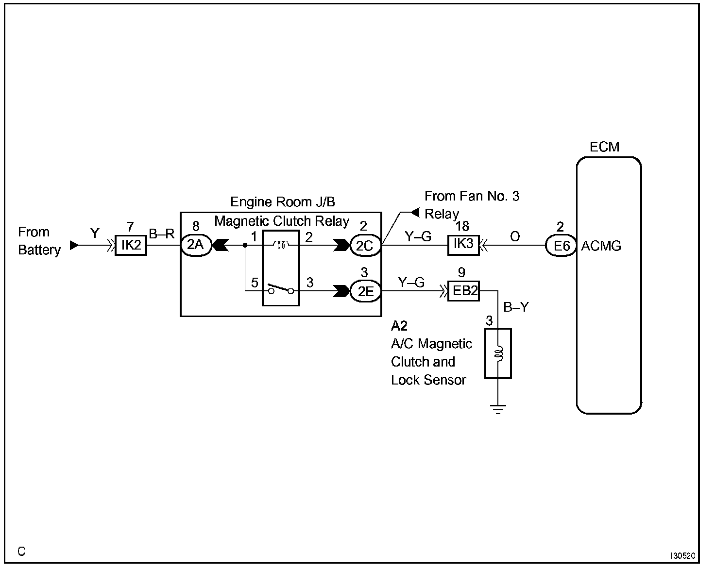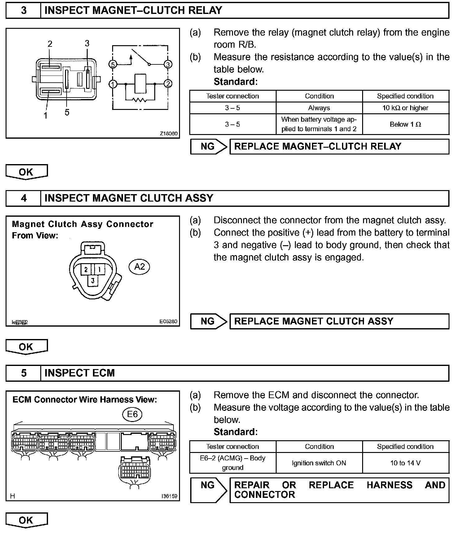 Receiving this signal, the ECM sends a signal through terminal ACMG and switches the magnetic clutch relay ON, thus turning on the magnetic clutch.