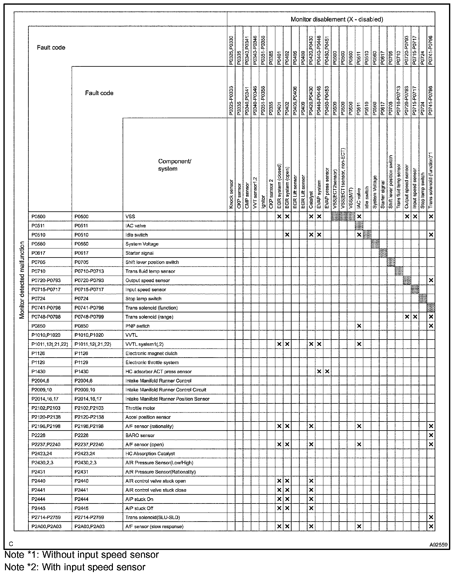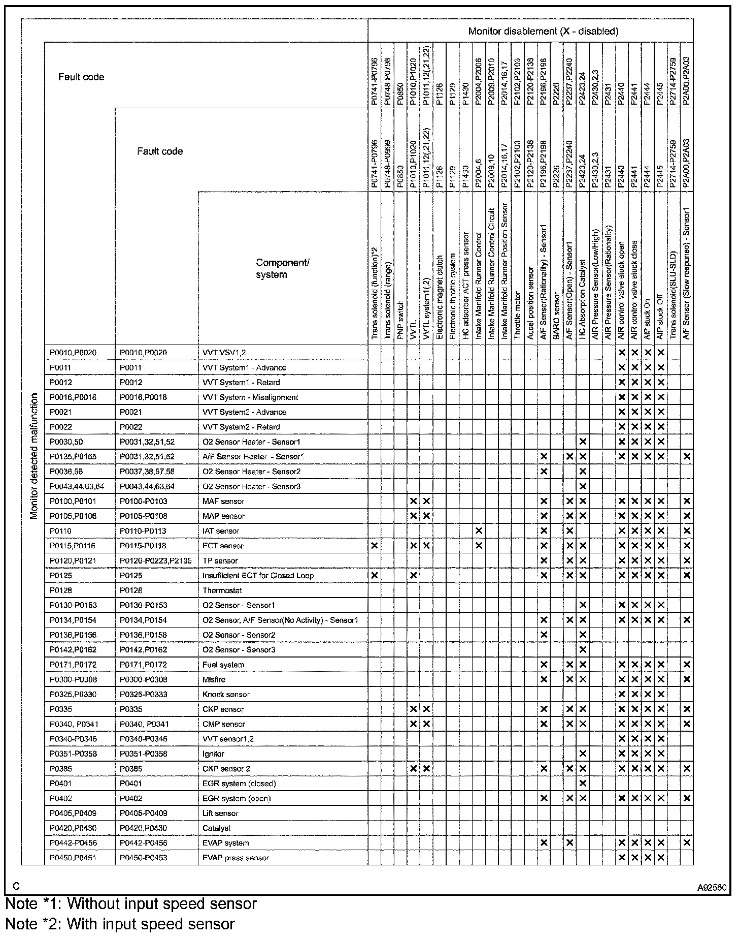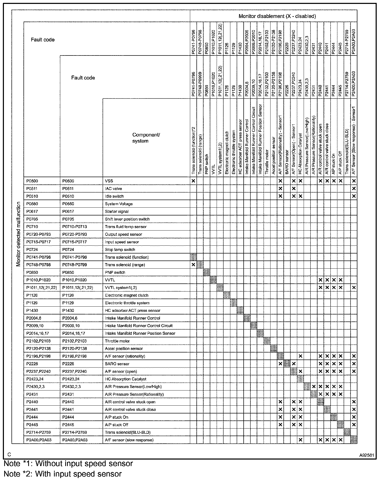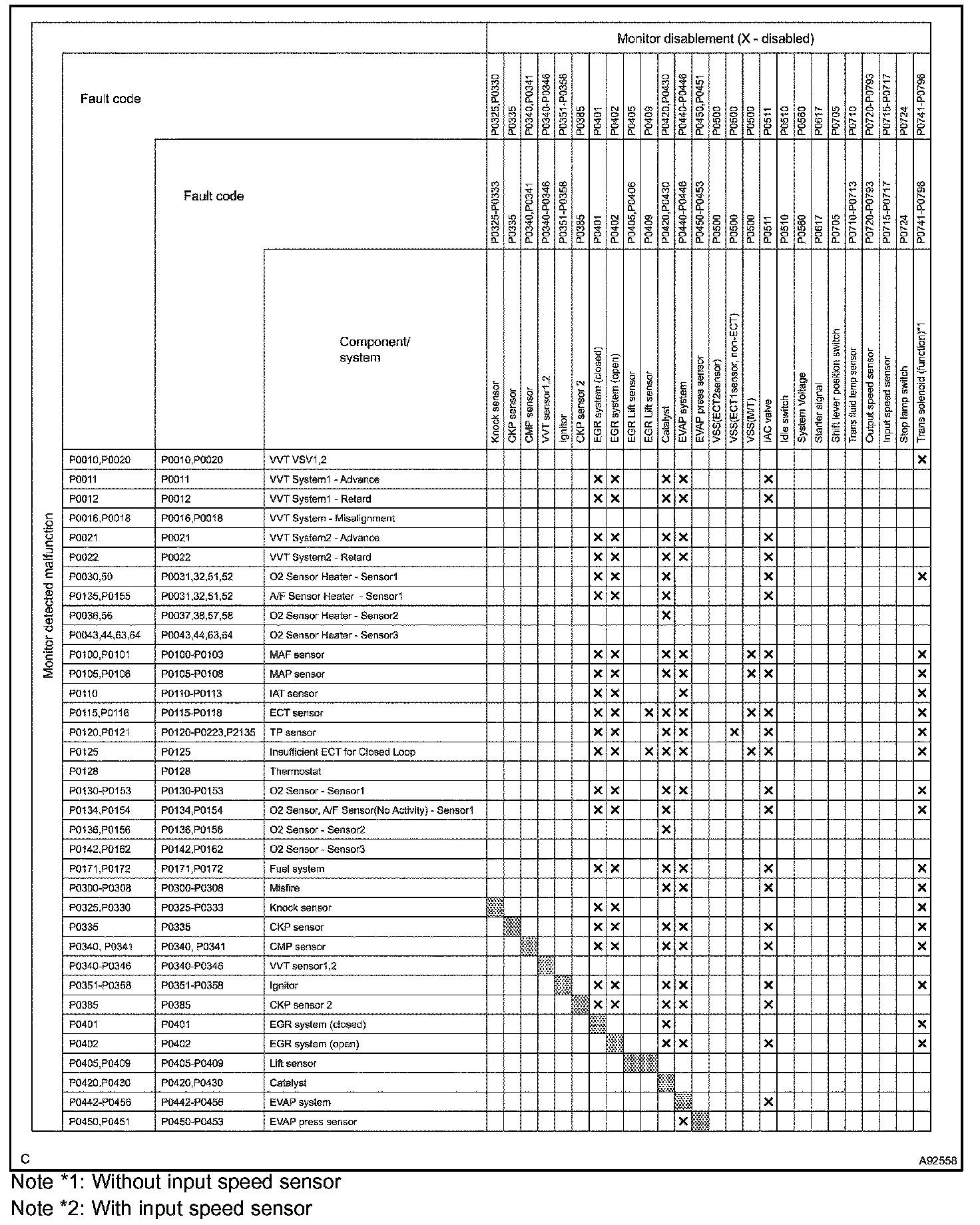 The table shows the ECM monitoring status for the components listed in the top of the table when the DTCs on the left of the table are set.