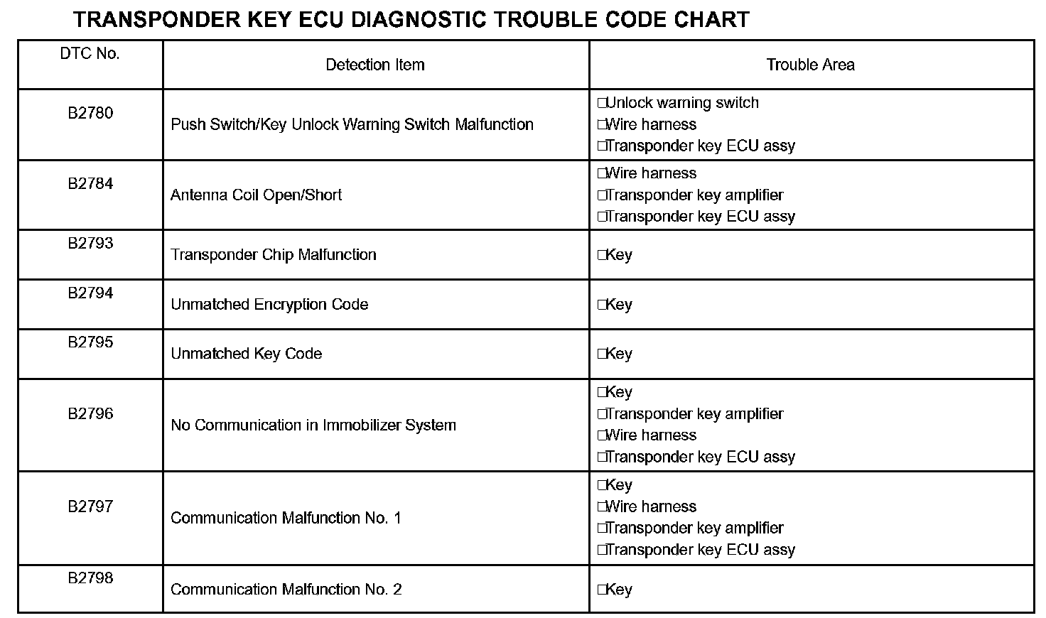 1. TRANSPONDER KEY ECU DIAGNOSTIC TROUBLE CODE CHART