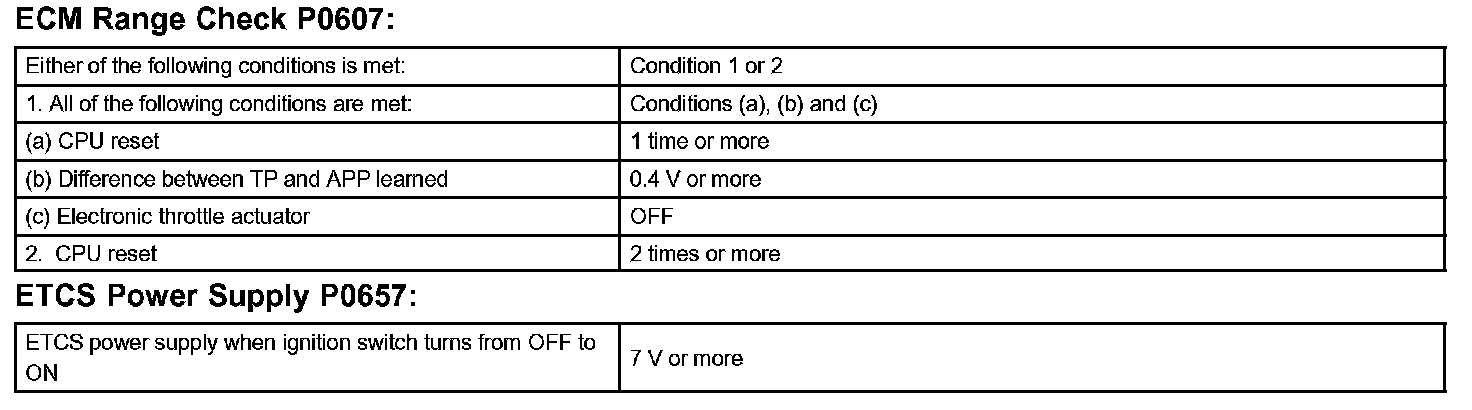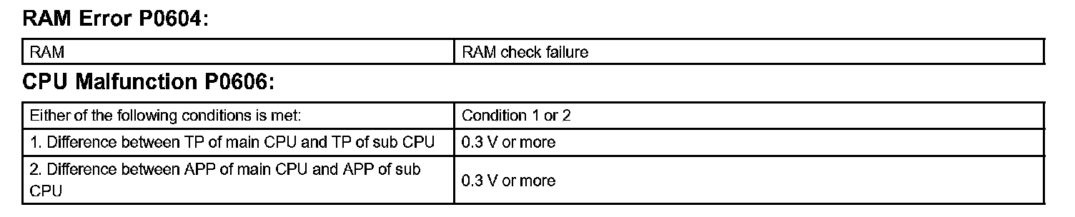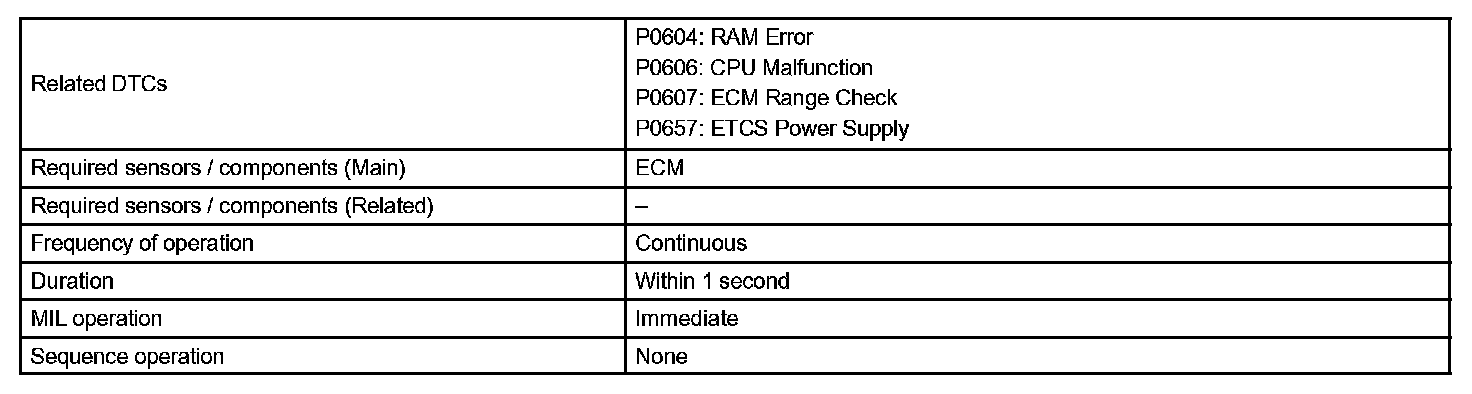The ECM memory status is diagnosed by internal "mirroring" of the main CPU and the sub CPU to detect Random Access Memory (RAM) errors. The two CPUs also perform continuous mutual monitoring. The ECM sets a DTC if: 1) outputs from the 2 CPUs are different and deviate from the standards, 2) the signals to the throttle actuator deviate from the standards, 3) a malfunction is found in the throttle actuator supply voltage, and 4) any other ECM malfunction is found.