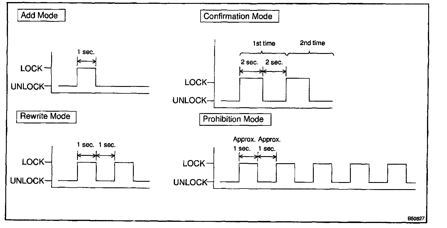 1. Within 40 seconds after the add mode or the rewrite mode has been selected, simultaneously press the LOCK and UNLOCK switches for 1.0 to 1.5 seconds. Then press either one of the switches for more than 1.0 second.