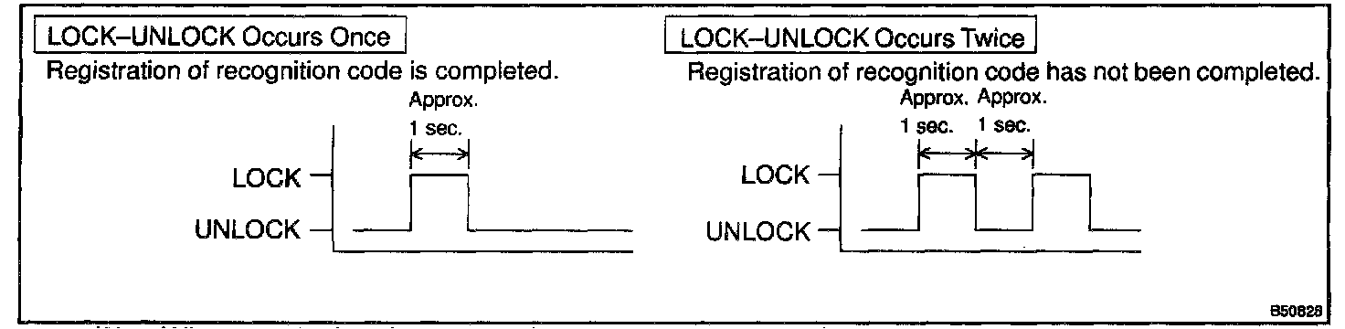 2. LOCK-UNLOCK operation is automatically performed once within 3 seconds after above operation (step 1), when the recognition code of the transmitter has been registered correctly. If the LOCK-UNLOCK operation is performed twice, the registration of the recognition code has failed. In this case, register the recognition code from the beginning of the registration procedures once again.