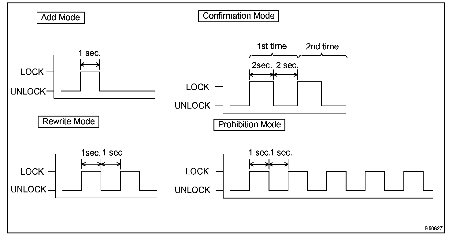 1. Within 40 seconds after the add mode or the rewrite mode has been selected, simultaneously press the LOCK and UNLOCK switches for 1.0 to 1.5 seconds. Then press either one of the switches for more than 1.0 second.