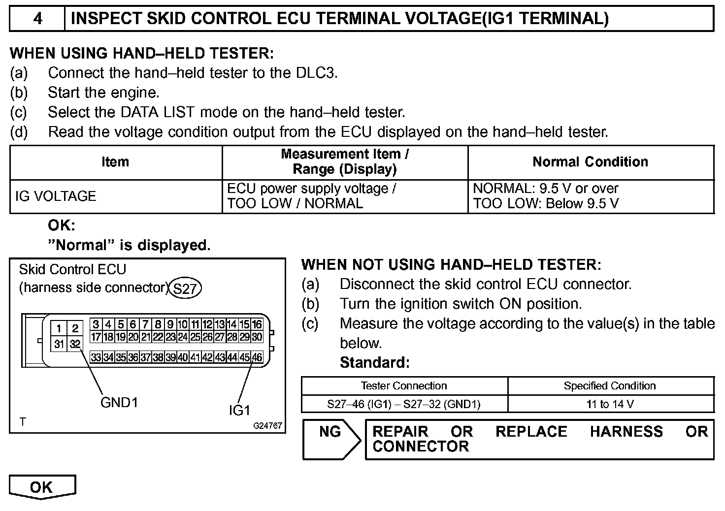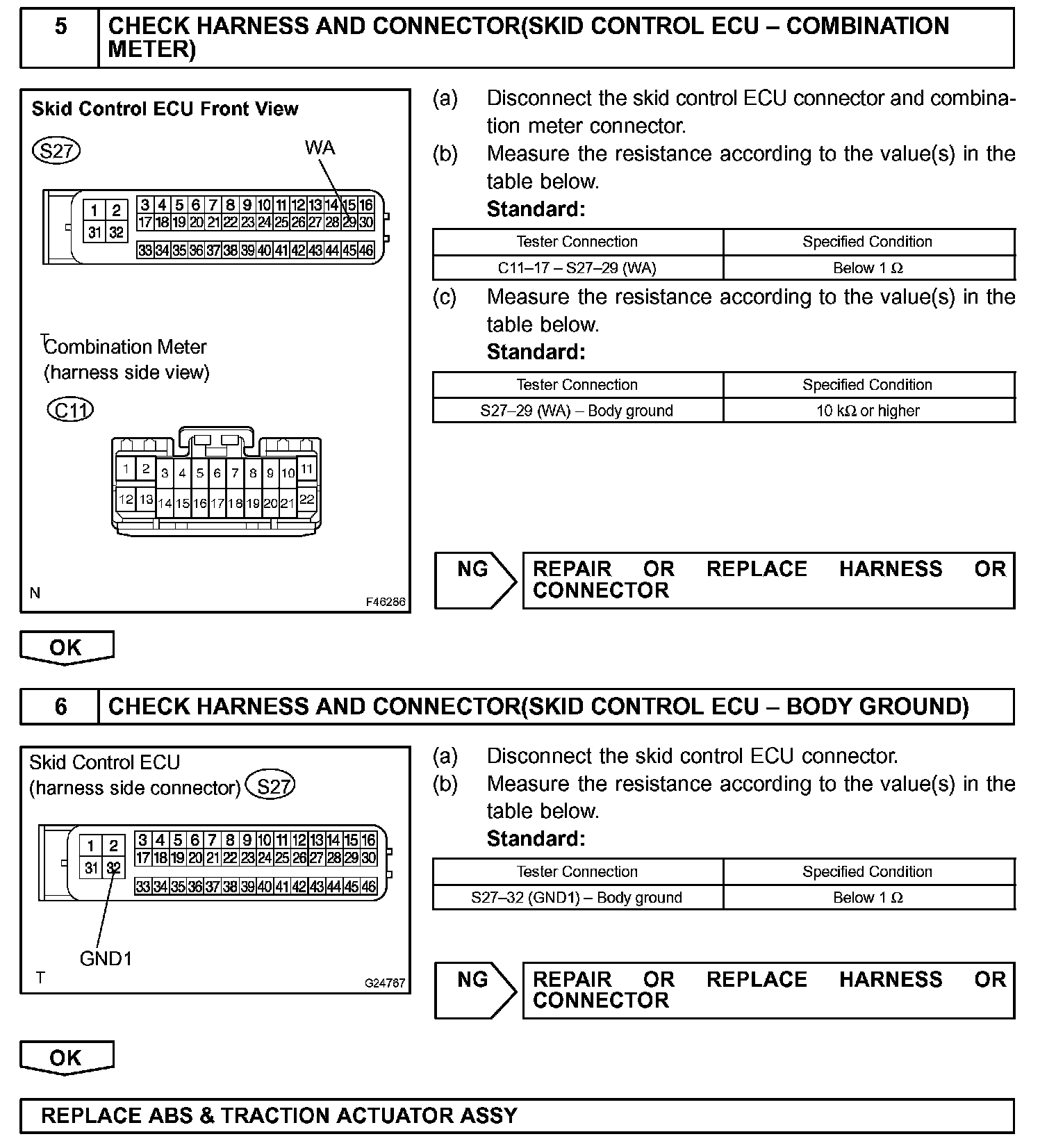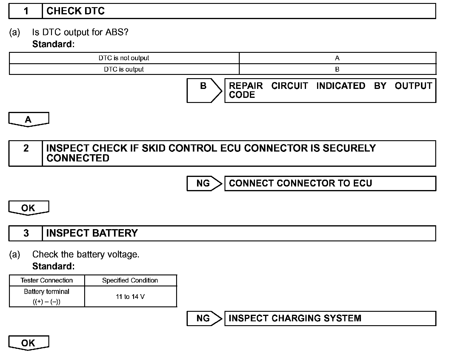 During DTC read by SST (CHECK WIRE), if the ABS warning light remains on, troubleshoot by following this inspection flow.