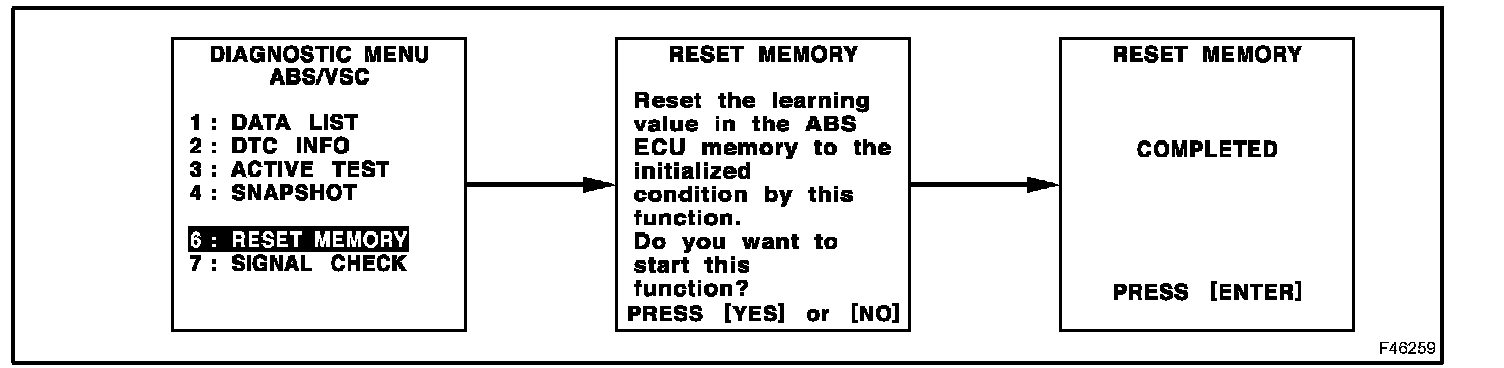 "DIAGNOSIS" - "OBD/MOBD" - Select the vehicle - "ABS/VSC" - "RESET MEMORY"