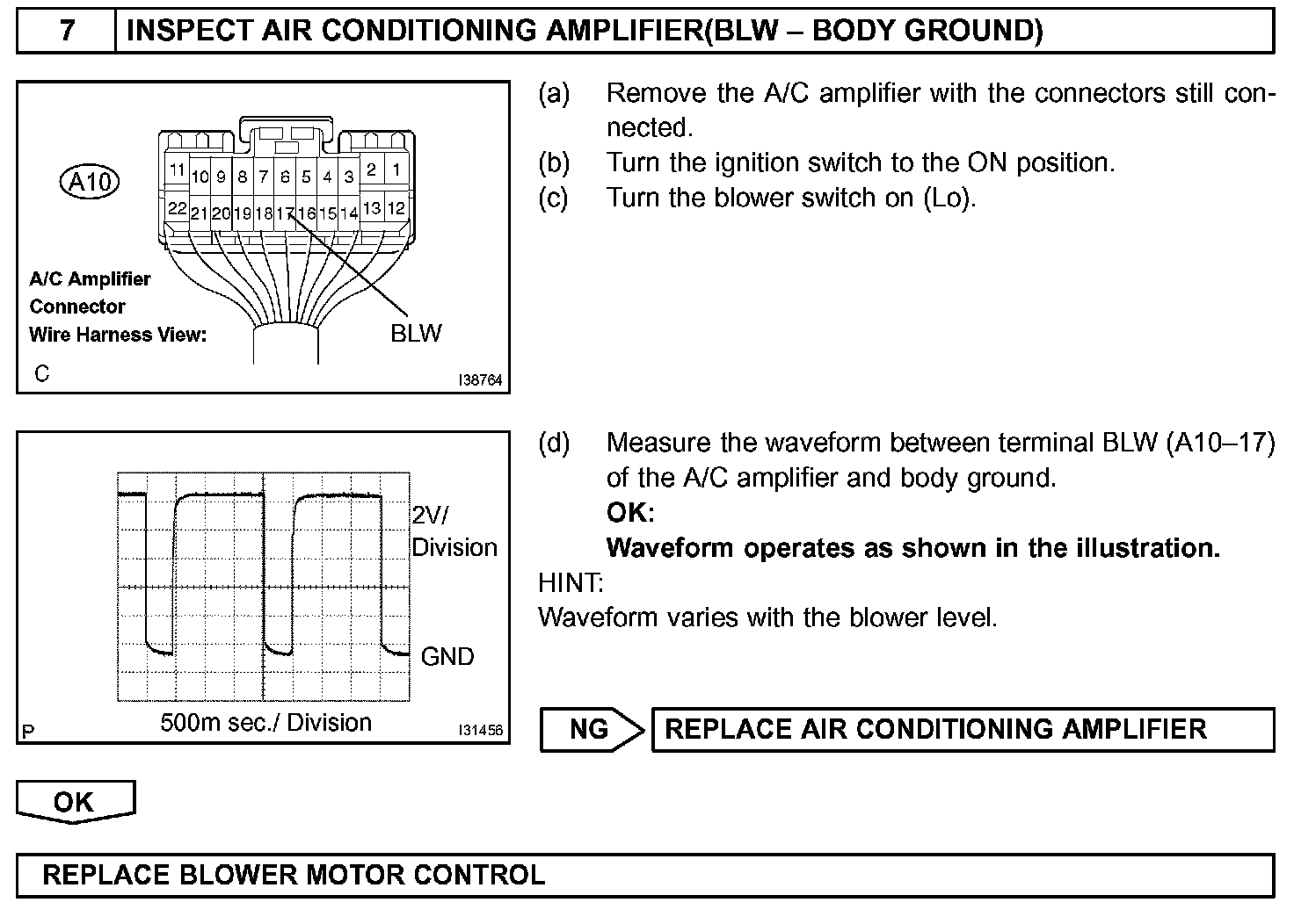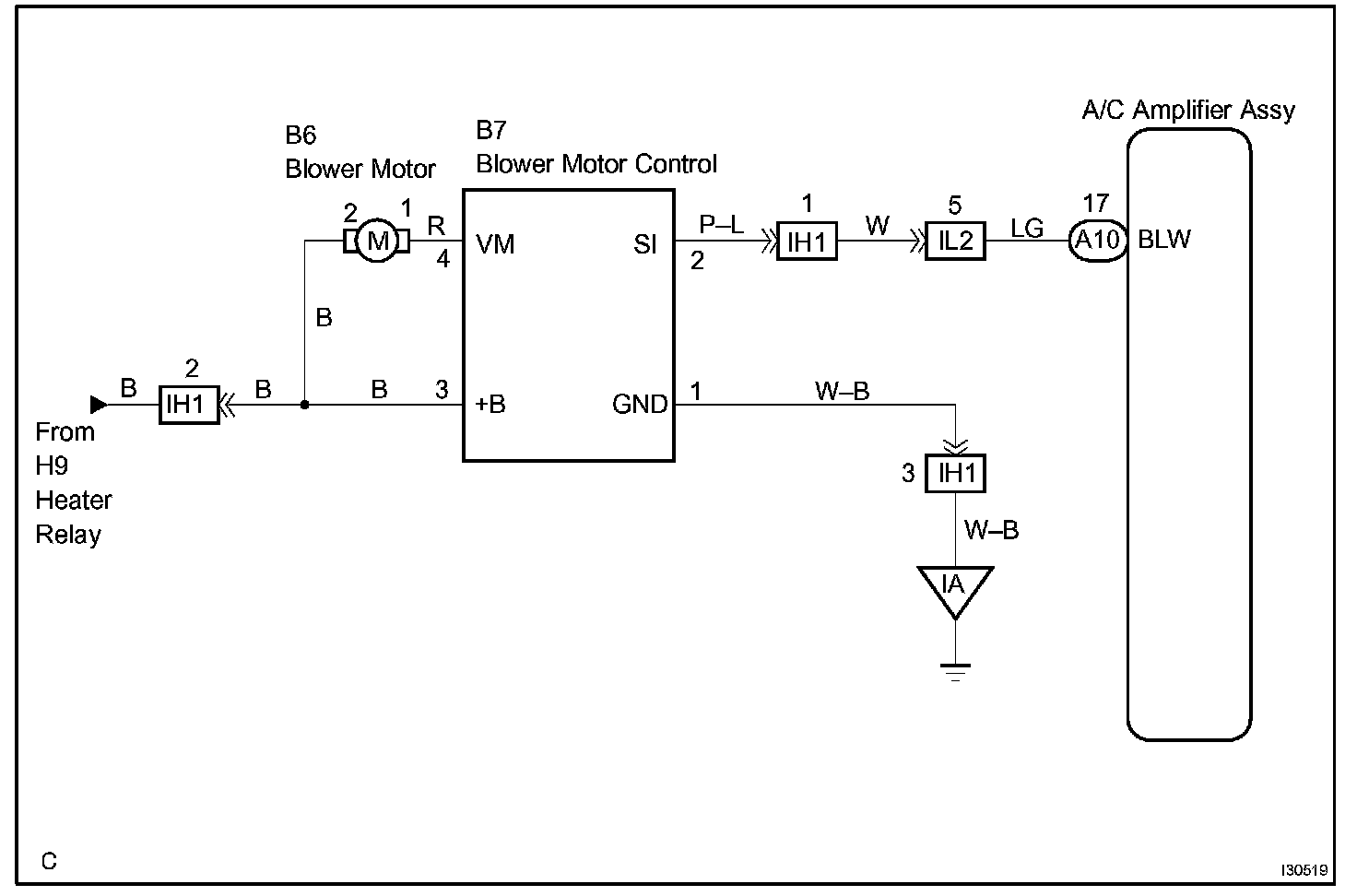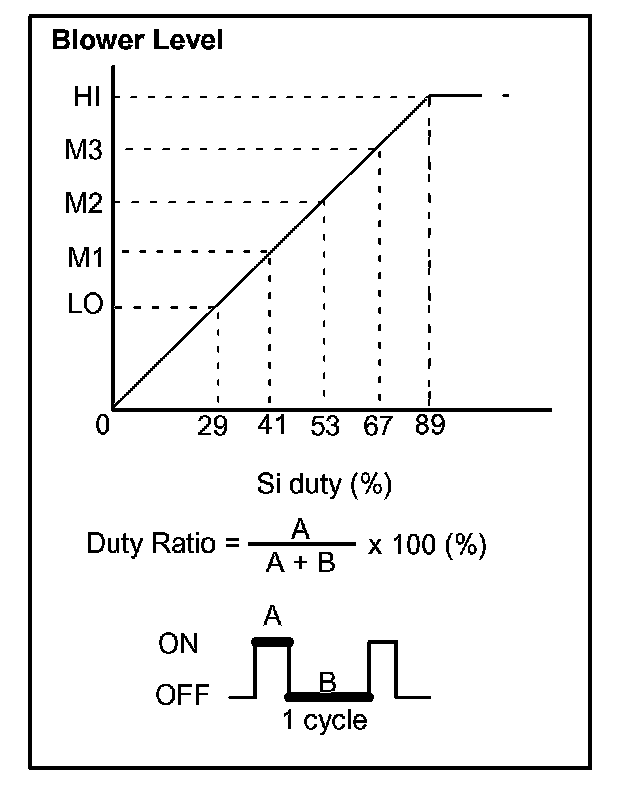 The blower motor is operated by signals from the A/C amplifier assy. Blower motor speed signals are transmitted by changes in the Duty Ratio.